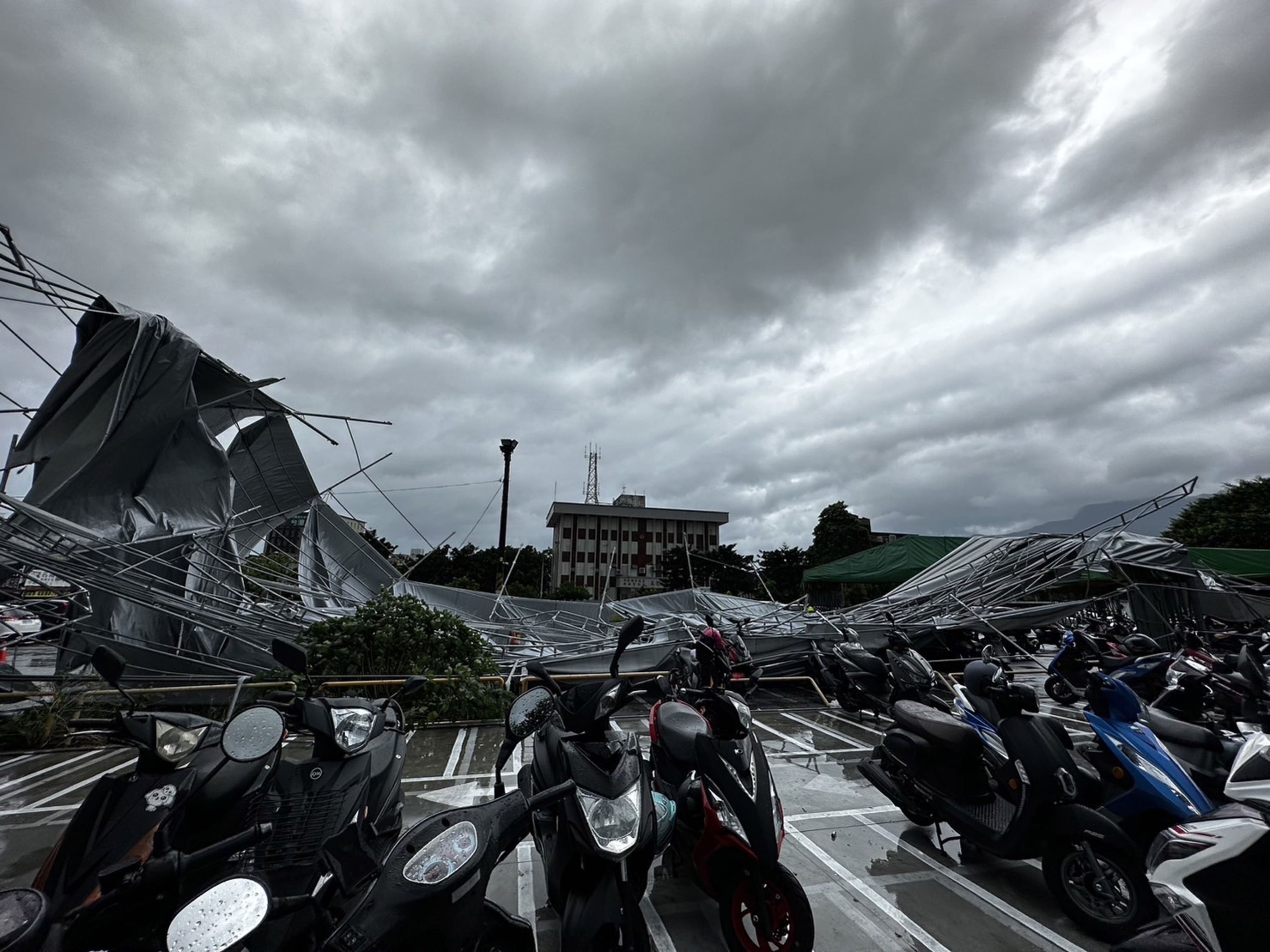 海葵侵襲下,花蓮間歇性颳強風下大雨。花蓮火車站旁一處機車遮雨棚架不敵強陣風,上午應聲倒塌,幸未造成人員受傷。另外,一輛小貨車上午遭路邊傾倒的大樹砸中,2人受傷送院治理。