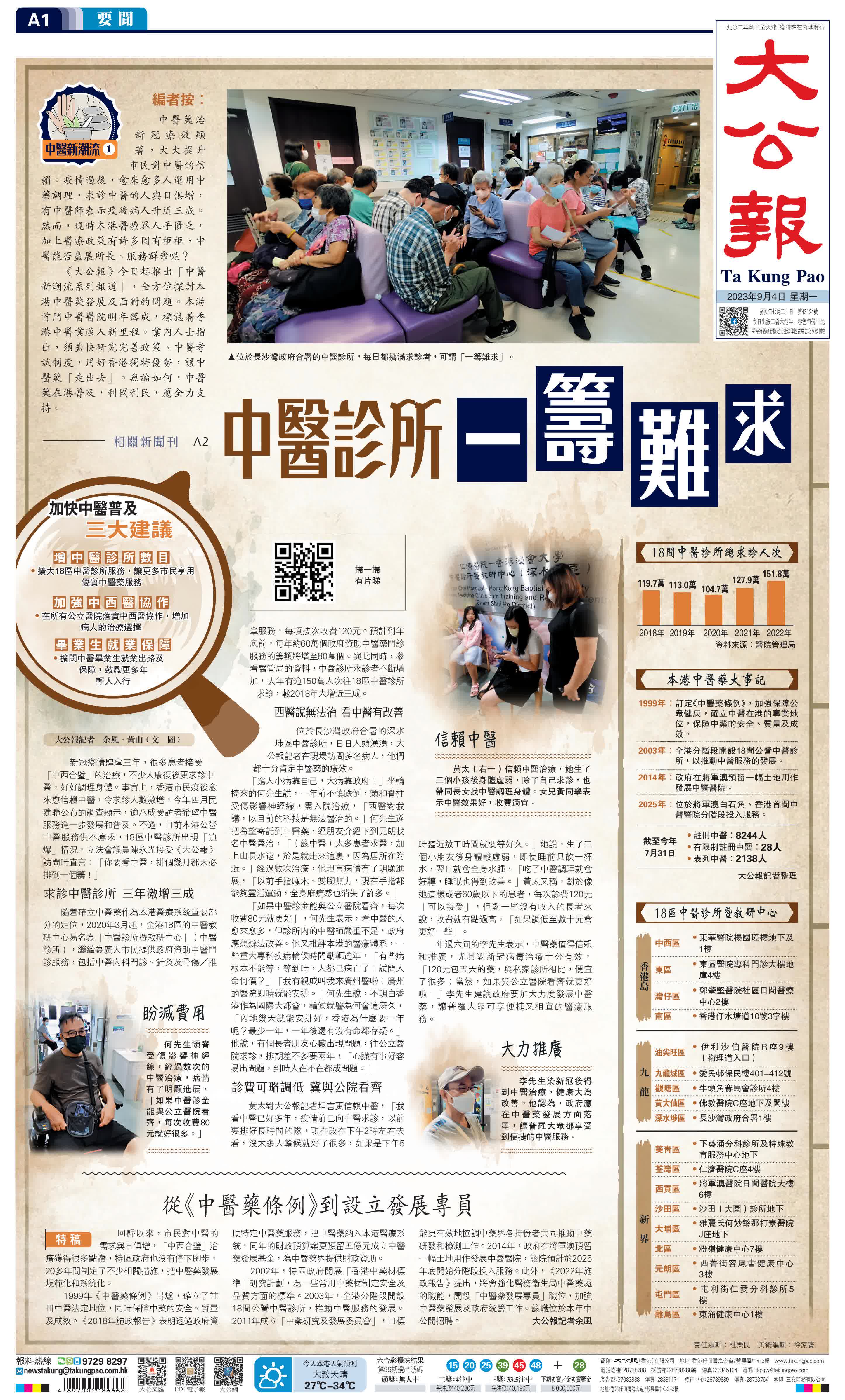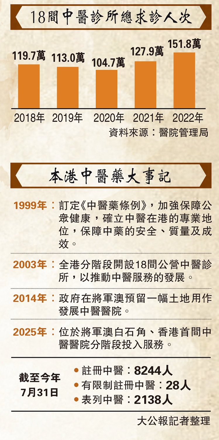 (大公報記者 余風<文>、黃山<圖>)新冠疫情肆虐三年,很多患者接受「中西合璧」的治療,不少人康復後更求診中醫,好好調理身體。事實上,香港市民疫後愈來愈信賴中醫,令求診人數激增,今年四月民建聯公布的調查顯示,逾八成受訪者希望中醫服務進一步發展和普及。不過,目前本港公營中醫服務供不應求,18區中醫診所出現「迫爆」情況,立法會議員陳永光接受《大公報》訪問時直言:「你要看中醫,排個幾月都未必排到一個籌!」