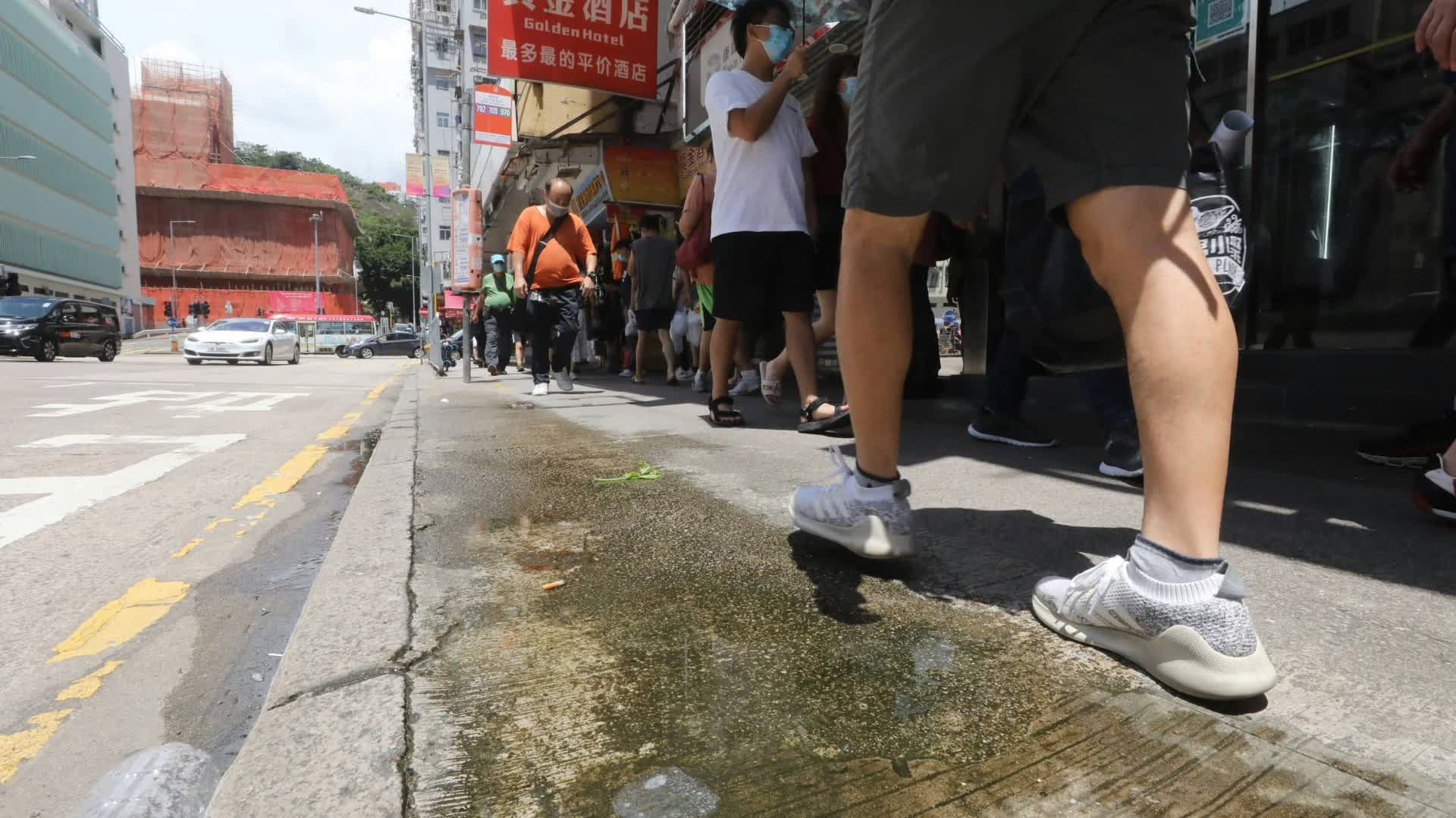 記者在荃灣眾安街所見,整排大廈外掛的窗口式冷氣機大多數都在「滴答、滴答」,有的甚至像下雨般持續不斷,很多路段都被冷氣機滴落的污水造成水氹,途人需左閃右避繞路而過。