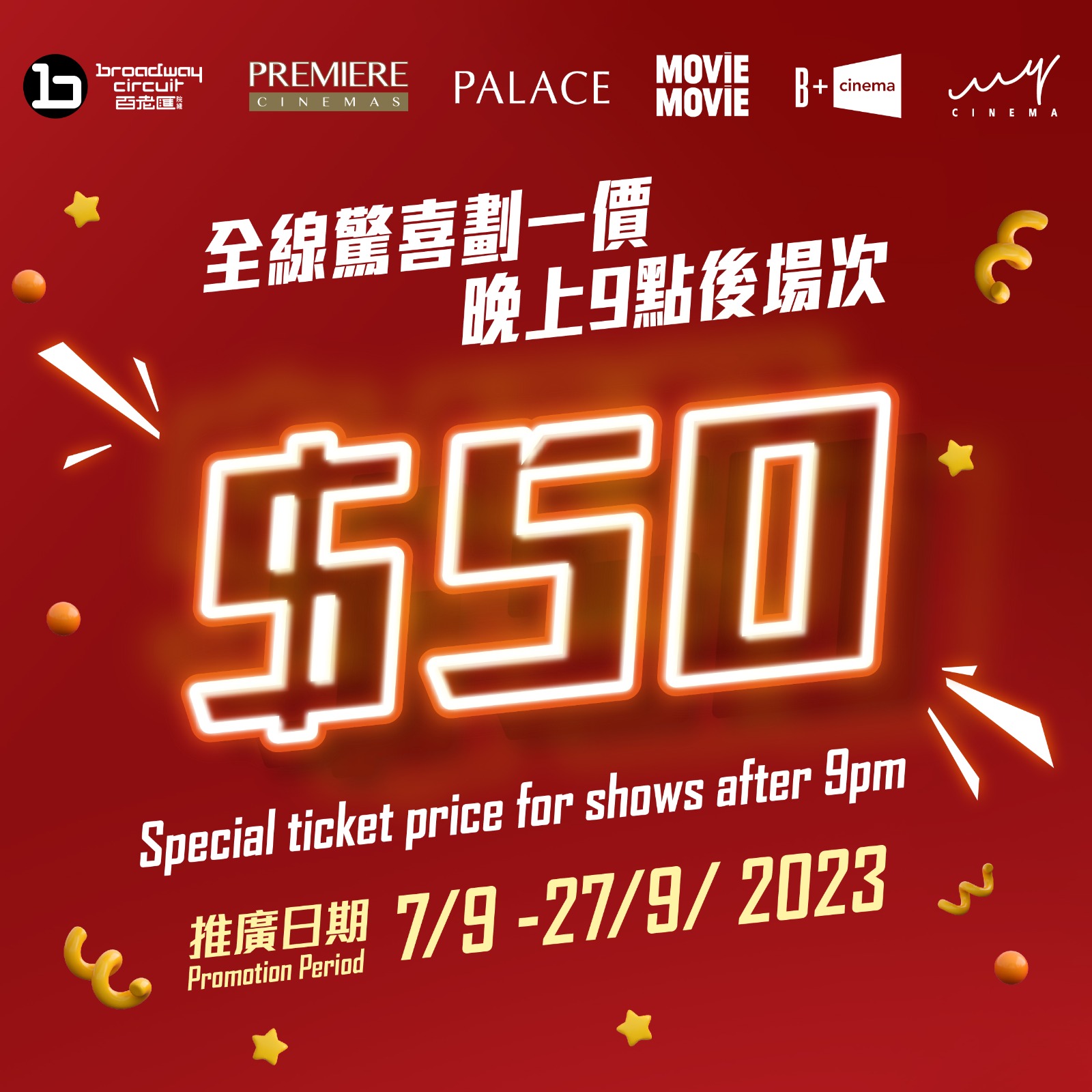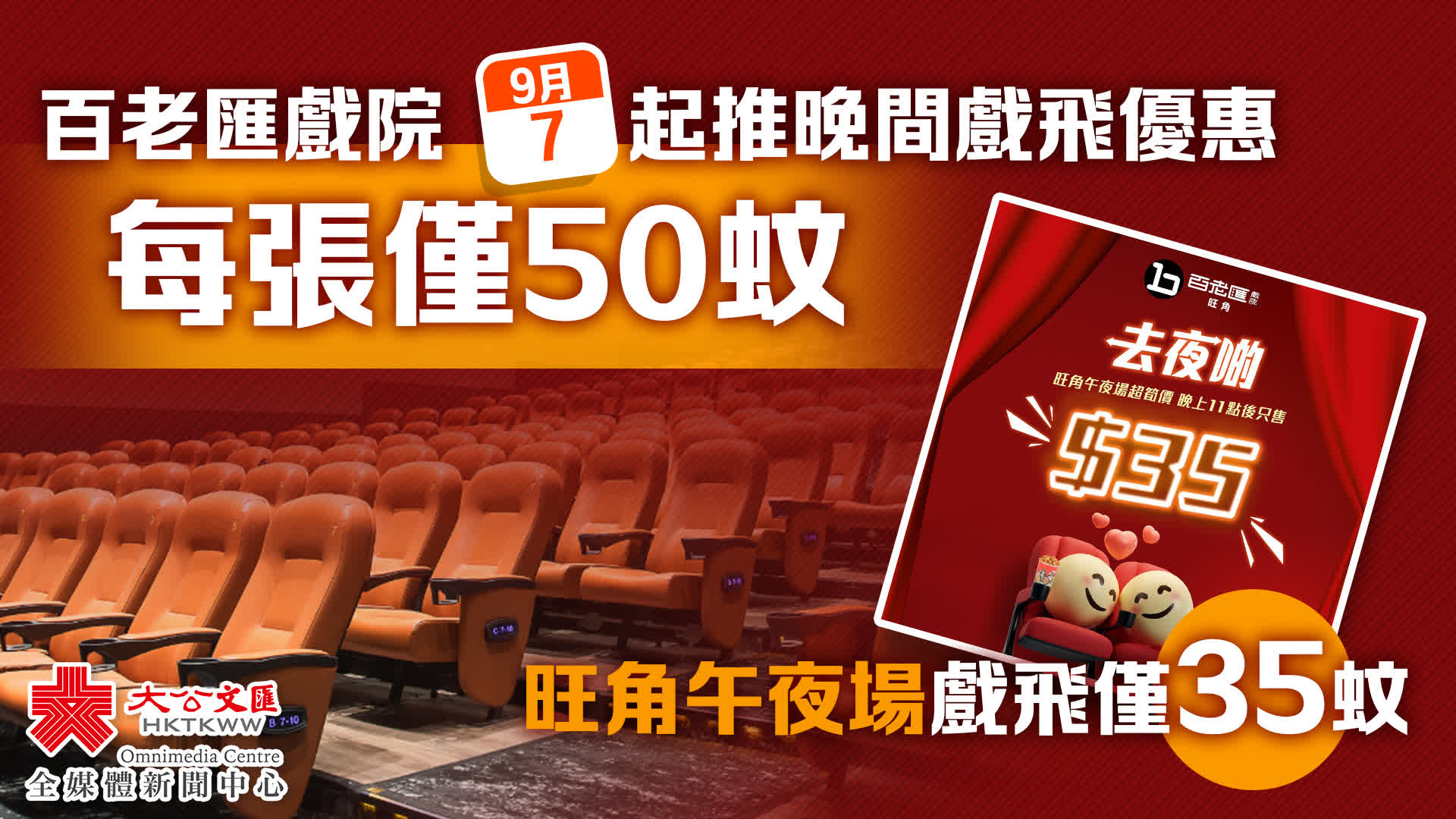 大公文匯全媒體報道,特區政府積極推動夜間經濟發展,繼太古地產及恆地宣布旗下部分商場在9月及10月將有推廣優惠後,百老匯戲院日前宣布推出晚間戲飛優惠。由明日(7日)起至9月27日,全線12間百老匯戲院推出每晚9時後,場次戲飛售50蚊,旺角百老匯午夜場晚上11時後35蚊。