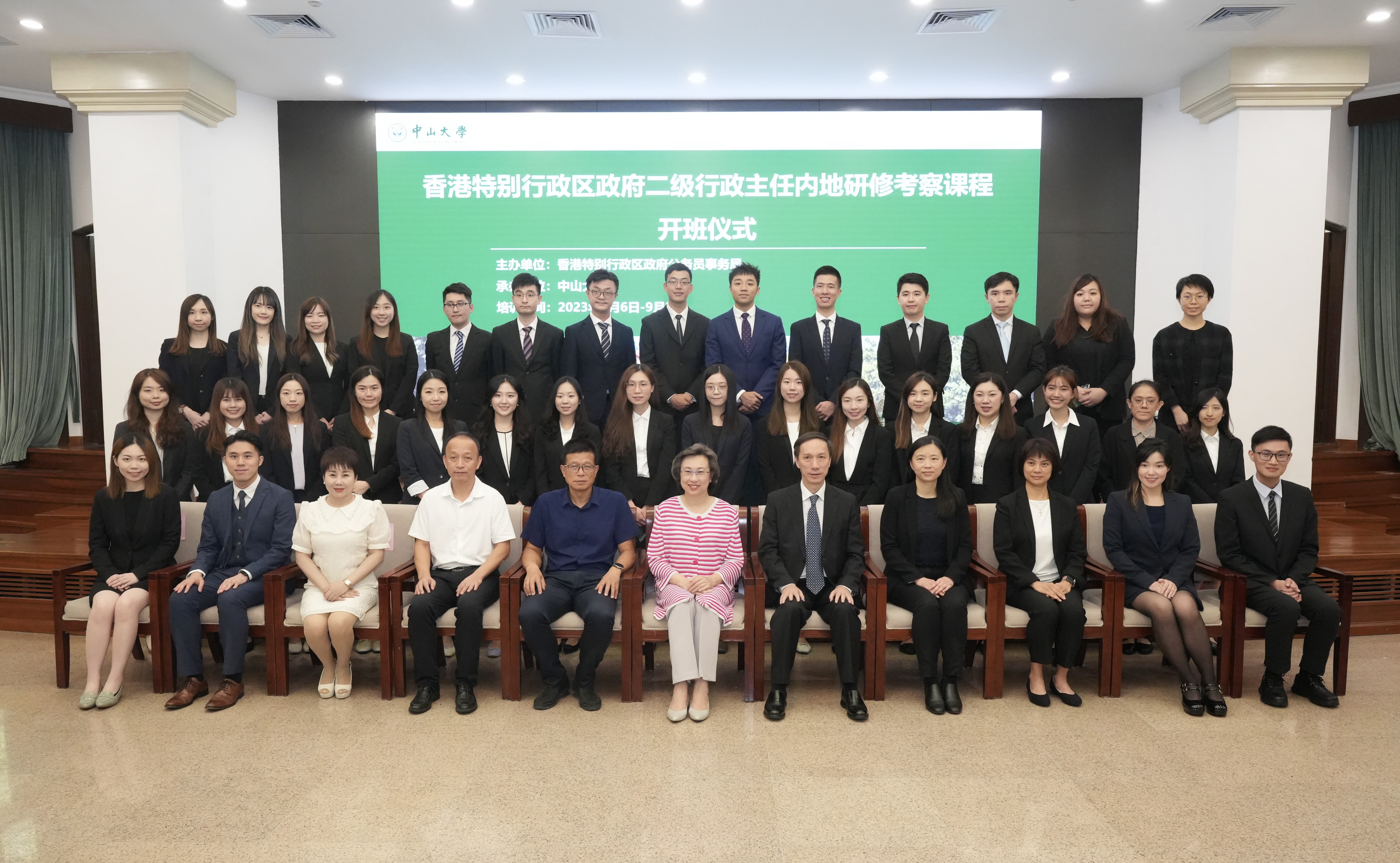 公務員事務局局長楊何蓓茵、中山大學副校長楊東華,以及公務員事務局一般職系處長陳信禧,在中山大學出席「二級行政主任內地研修考察課程」開班式。楊何蓓茵鼓勵各同事把握學習機會,多用心,多觀察,增廣見聞,並期望學員可利用學習所得,更有效發揮專業管理人員的角色,貢獻國家,回饋社會。