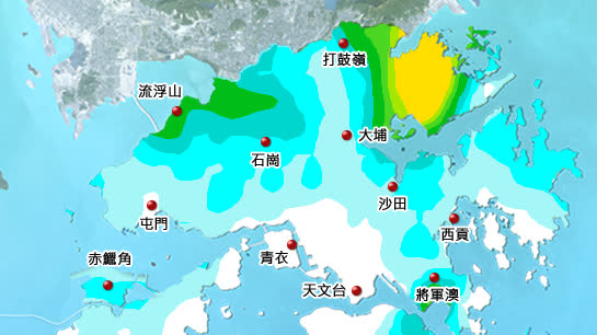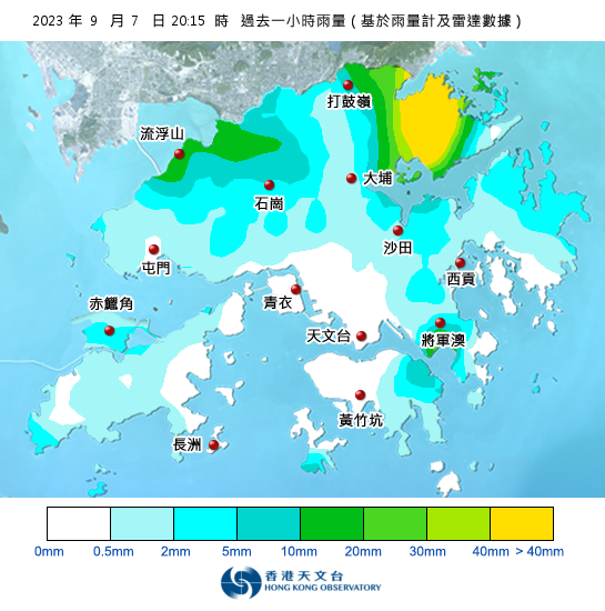 另外,天文台在20時20分發出局部地區大雨提示,指出新界北區及大埔區的雨勢特別大,並已錄得或預料會有每小時雨量超過70毫米的大雨,有可能出現嚴重水浸。
