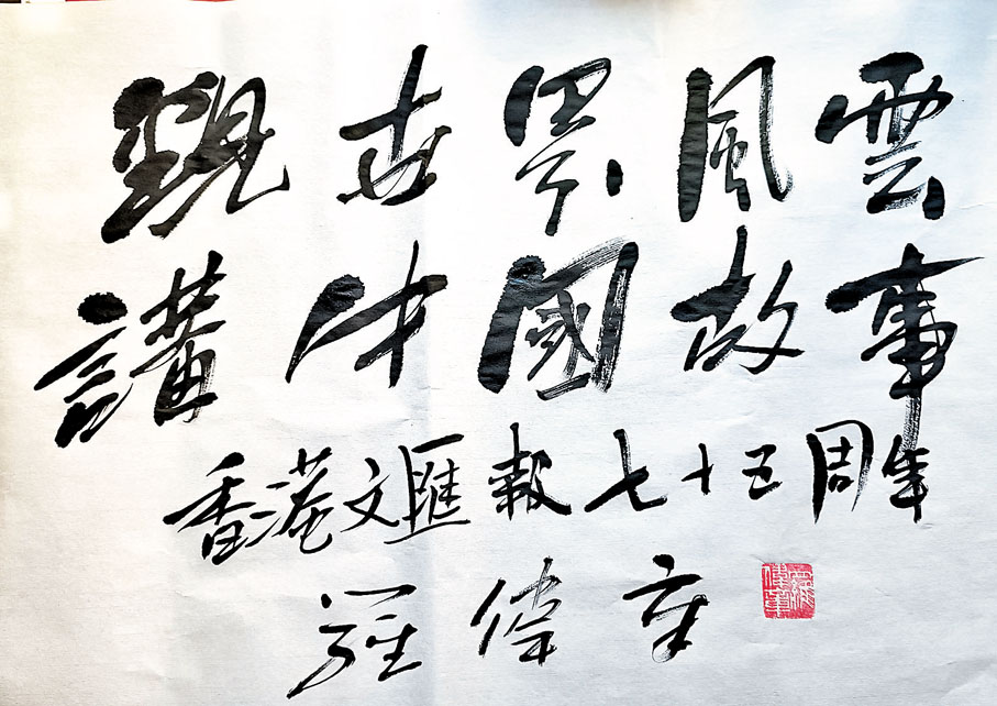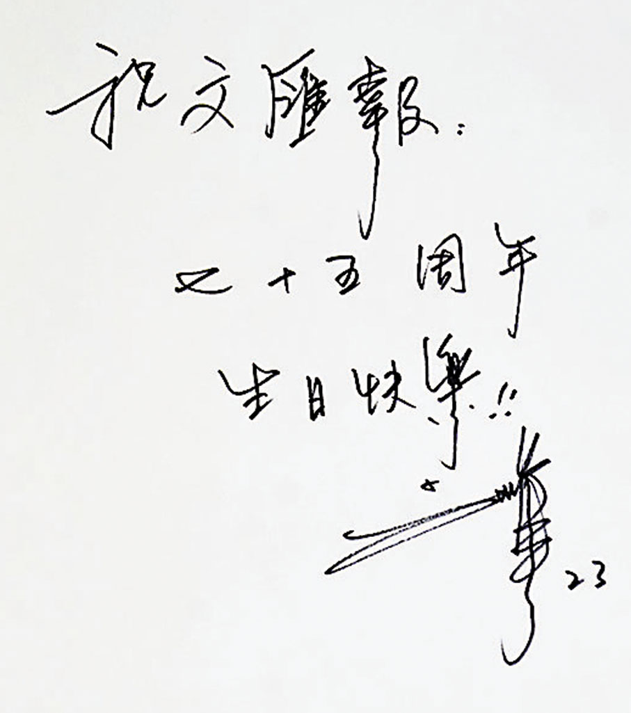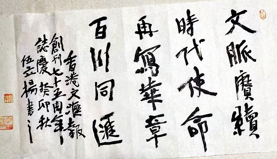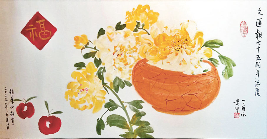 香港《文匯報》明日正式迎來創刊75周年,一班文藝界知音好友揮毫潑墨,寫下真摯祝願!著名畫家、陶瓷藝術家劉勇(一澄)以畫作《總有一些開心事》祝賀75周年盛事;漫畫家黃玉郎以漫畫手稿表達恭賀和祝願;施學概作詩、梁君度落墨共祝「向遠時光茁,恭聲紅幟遵」;出版人梁振輝寄語「不亢不卑迎挑戰,戮力同心勢續延」;來自內地的作家周大新、梁鴻鷹、羅偉章及伍立楊亦讚賞《文匯報》為「讀者的朋友」、「攬五洲風雲,傳中華文脈」、「觀世界風雲,講中國故事」及「文脈賡續,時代使命,再寫華章,百川同匯」。演藝界鍾鎮濤以「文匯新聞貼民生,報網齊動通人心」,劉德華、陳勉良用作品祝賀,一番濃濃情意將永記在香港《文匯報》的報史上。