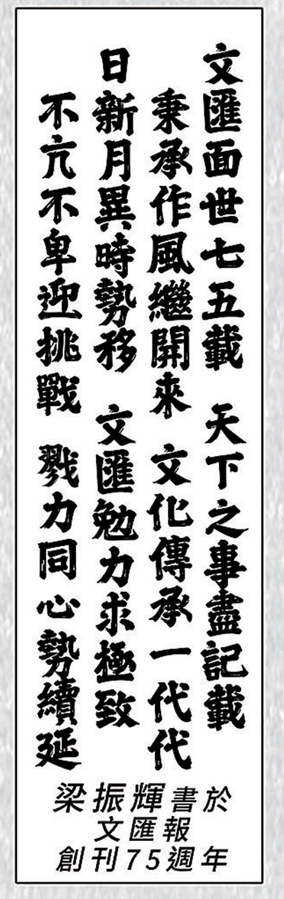 1948年9月9日,一份由李濟深、何香凝等進步人士在香港創辦的報紙 ——香港《文匯報》正式誕生。香港《文匯報》創刊初期由徐鑄成主其政,人文薈萃,郭沫若、茅盾、千家駒、翦伯贊、柯靈、胡繩等均參與採編工作,真是集中國名家之大成,成為中國新聞史上一大奇觀。《文匯報》的文藝版刊登有不少內地大家的作品,譬如巴金、茅盾、蕭乾、秦牧、黃秋耘、陳殘雲等人的隨筆,是那個年代的文藝少年的最愛,也孕育出不少文字工作者或作家,成為文化界的主力軍。《文匯報》在不同年代都有不同的參與者和支持者,有文學作家、文化人、藝術家、電視人、編劇家、報人、教育家等曾在此園地筆耕、發表作品,與他們的知音互動。正如有讀者所說,《文匯報》一直以來保持海納百川的特色。專欄文化版就是同版內南腔北調各地作者並存,可從不同語言風格文章中品嘗不同作者的生活方式,從用詞異同感受到那種南北融合與差異,也是無形的奇趣。廣東話普通話打成一片,溝通不再存在障礙,豐富了語言世界,可說是文字帶出生活的一大樂事。《文匯報》創刊至今75年仍堅守信念,不忘初心,以文匯友,與讀者風雨同舟,繼續發揮自己的影響力!