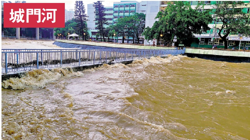 黑雨期間,城門河的河水亦相當洶湧,網上流傳短片所見,沙田美田邨及美林邨對開的城門河,有洪水如瀑布而下,猛烈衝擊兩岸,浪濤湧入較低橋面,美林商場橋底下的城門河,泥黃色的河水湍流不斷。有網上的車Cam影片發現,上午9時許,城門河上游近香粉寮村的河水洶湧澎湃,濺上一旁的車路。在中午時分,該區洪水稍為緩和,有居民表示,曾經有河水湧上行人路,警方封鎖了兩旁道路,以防市民遇上被洪水沖走等危險。
