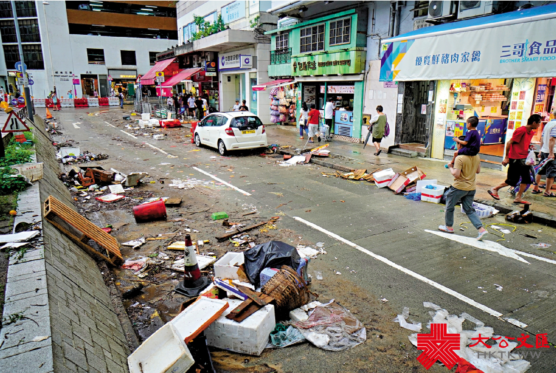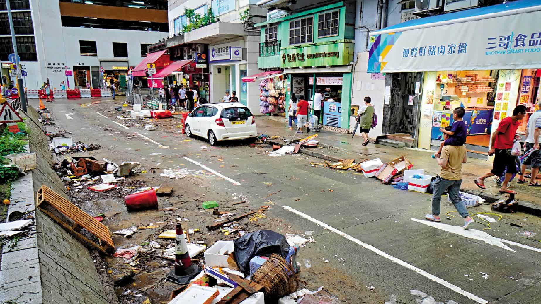 黑色暴雨過後,積水大致退卻,各區馬路和行人路布滿樹枝和磚頭等雜物,柴灣環翠道和環翠里部分路面被沖毀。昨午現場所見,部分路面碎開成一塊又一塊,碎石和泥沙散滿各處;北角春秧街和馬寶道一帶,路面環境惡劣,有街坊表示,前夜附近街道出現輕微水浸,泥水在雨後散退,但道路散落大大小小的垃圾,傳出陣陣臭味。