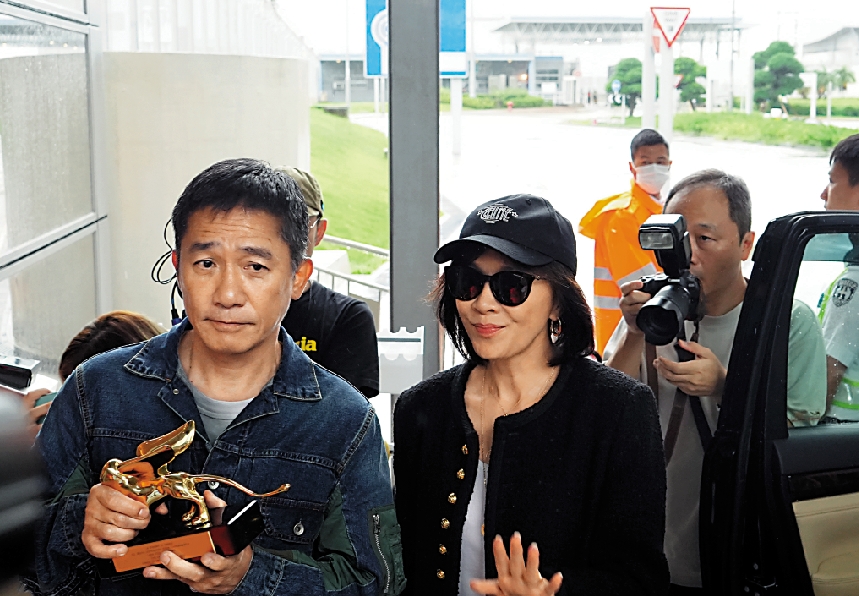 梁朝偉(偉仔)原定昨早7時40分抵港,最後航班延遲了20分鐘。大約9時18分,一身牛仔服飾的偉仔手捧「金獅」,偕同太太劉嘉玲終現身機場貴賓室通道會見傳媒。