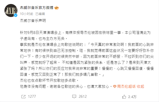 周杰倫經紀公司杰威爾音樂官方微博發微博澄清事件,稱有媒體報道杰倫被困在鐵球裏一事,公司澄清此為子虛烏有,也與主辦方無關。聲明稱,周杰倫身體沒有問題,謝謝各位歌迷的關心,也請大家放心。