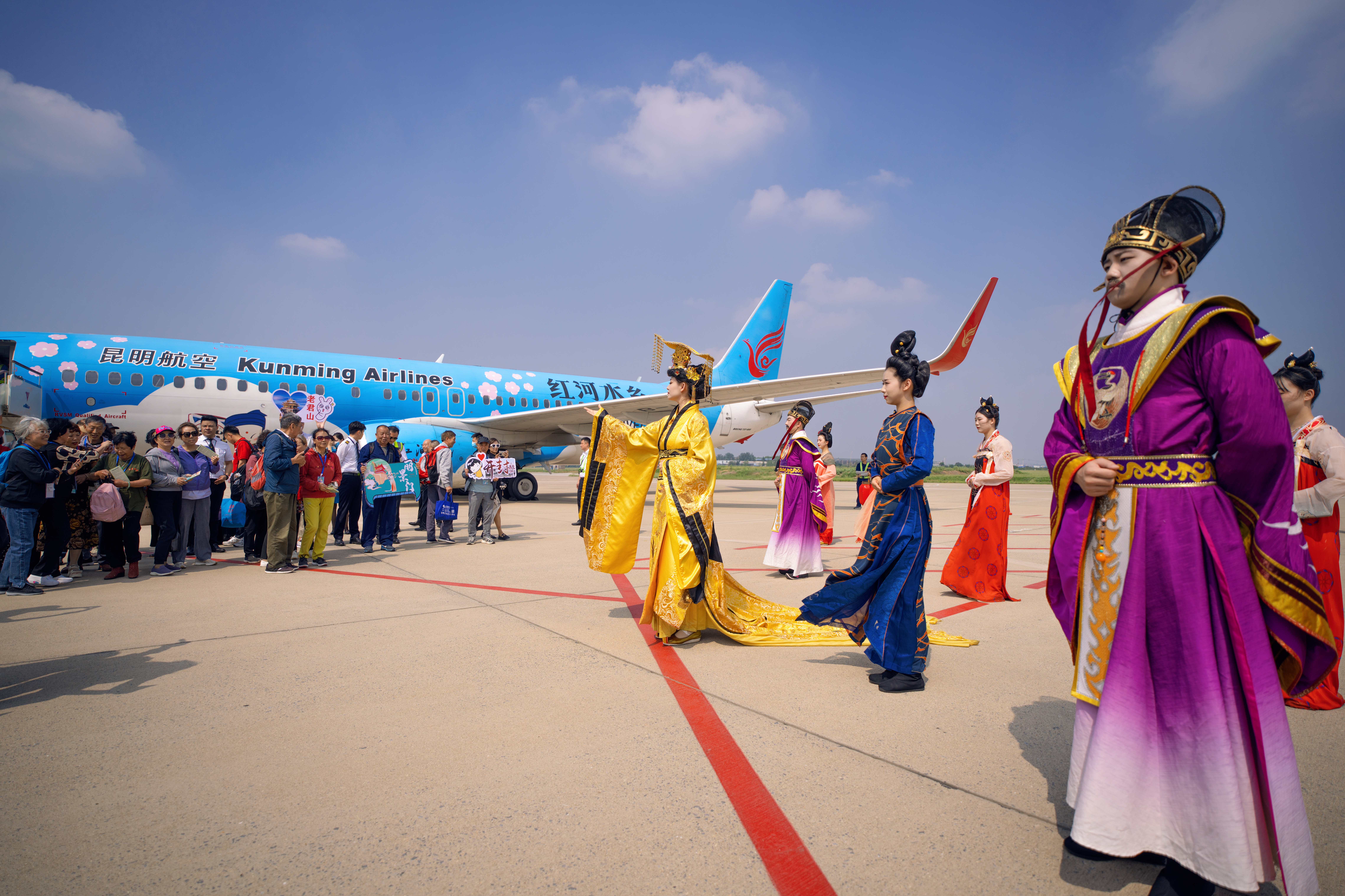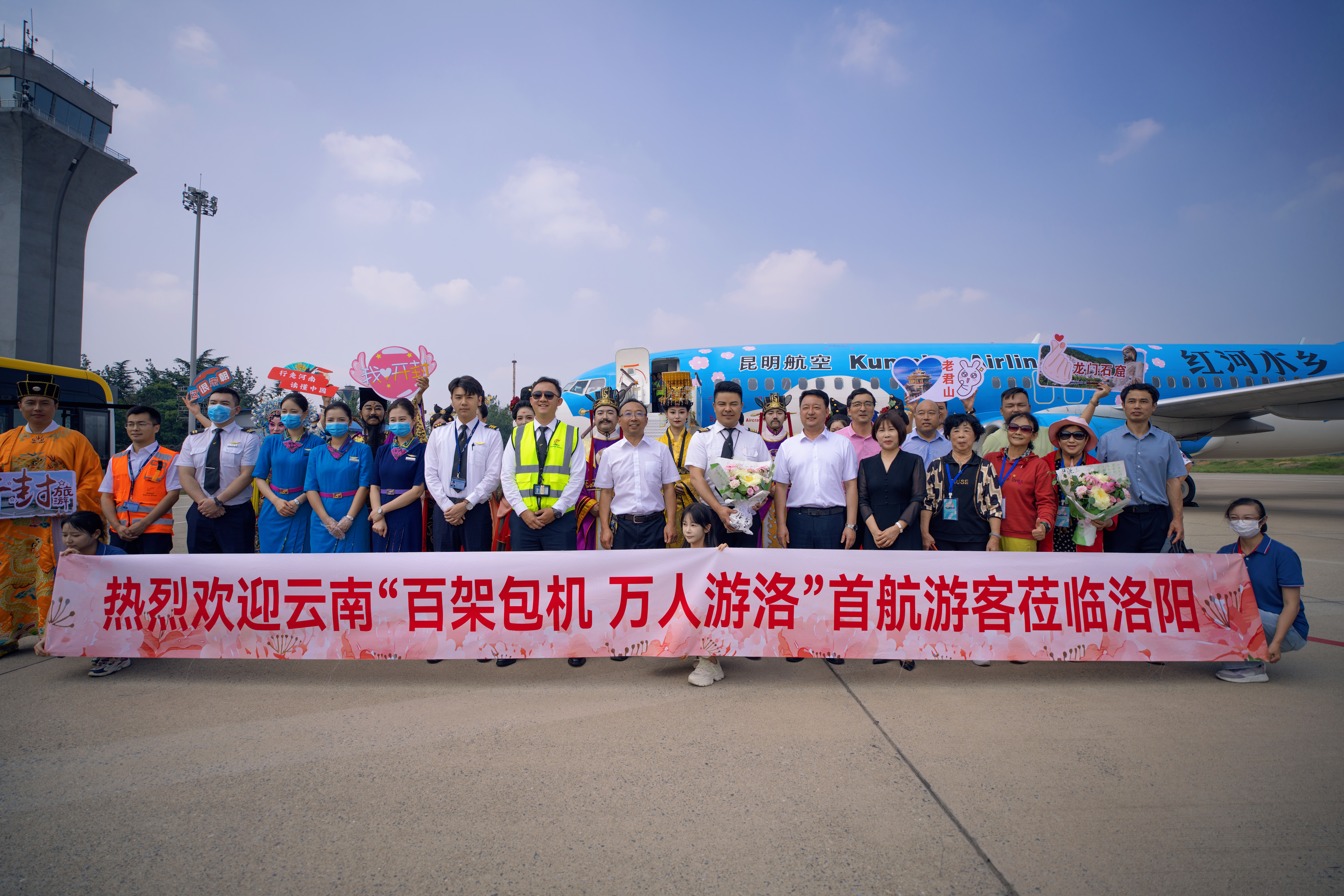 8日,160多名雲南遊客乘坐旅遊包機抵達洛陽北郊機場,這是今年洛陽迎來的首個包機旅遊團隊,正式拉開了「百架包機,萬人游洛」雲南旅遊包機活動的序幕。河南省文旅廳二級巡視員師東坡、洛陽市政府副秘書長崔小梅等為遊客代表送上洛陽牡丹花。現場舉行了武皇迎賓儀式,熱情迎接來洛觀光旅遊的遊客,並為每位遊客送上洛陽手繪地圖等伴手禮。據悉,該旅遊團隊將在洛陽度過3天3晚,遊覽老君山、龍門石窟、白馬寺、明堂天堂、洛邑古城、麗景門等多個景區,遊客們可沉浸式遊覽洛陽美景,感受洛陽厚重的歷史文化。「百架包機,萬人游洛」雲南旅遊包機活動由河南康威國際旅行社聯合雲南科達國際旅行社等三家公司聯合承辦,兩地旅行社聯合從9月8日至10月23日組織昆明至洛陽旅遊包機50架次,進出洛陽北郊機場,輸送遊客逾8000人,遠期將發送超百架次、超萬人遊覽洛陽。