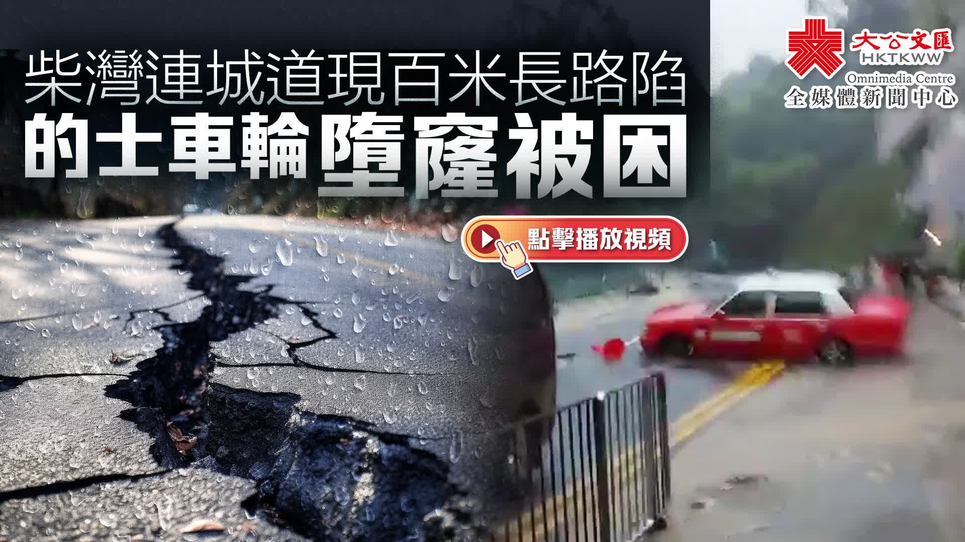 大公文匯全媒體報道,世紀暴雨持續近17小時,本港多處路面嚴重受損。今(10日)晨約7時黃雨期間,柴灣連城道發生路陷,一輛的士被困,司機自行離開,並無受傷。