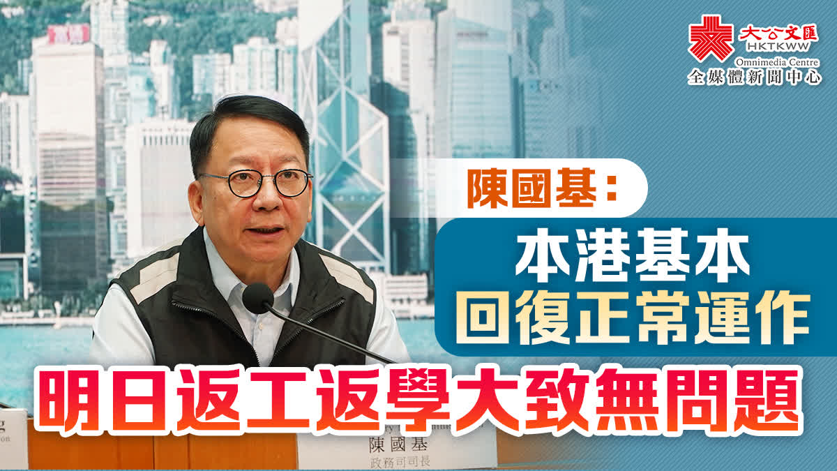 大公文匯全媒體報道,本港近日受到海葵殘餘相關低壓槽帶來的暴雨影響,政府進行全方面應對和善後工作。今日(10日)下午,政務司司長陳國基聯同相關部門代表會見傳媒,公布政府跨部門善後工作進度,讓市民更掌握目前的情況。陳國基表示,近日的特大暴雨造成廣泛地區水浸和山泥傾瀉,多區出現極端情況。連日來在行政長官指示下,政府各相關政策局和部門同事,全力全速進行各方面的應急和善後的工作,務求讓廣大市民能夠盡快全面回復正常生活。他指,本港現時整體上已回復基本正常運作,明日上學或上班沒有問題。至於個別學校因善後清理工作需要,而暫時未能恢復面授安排,教育局會保持跟進,提供適切支援。