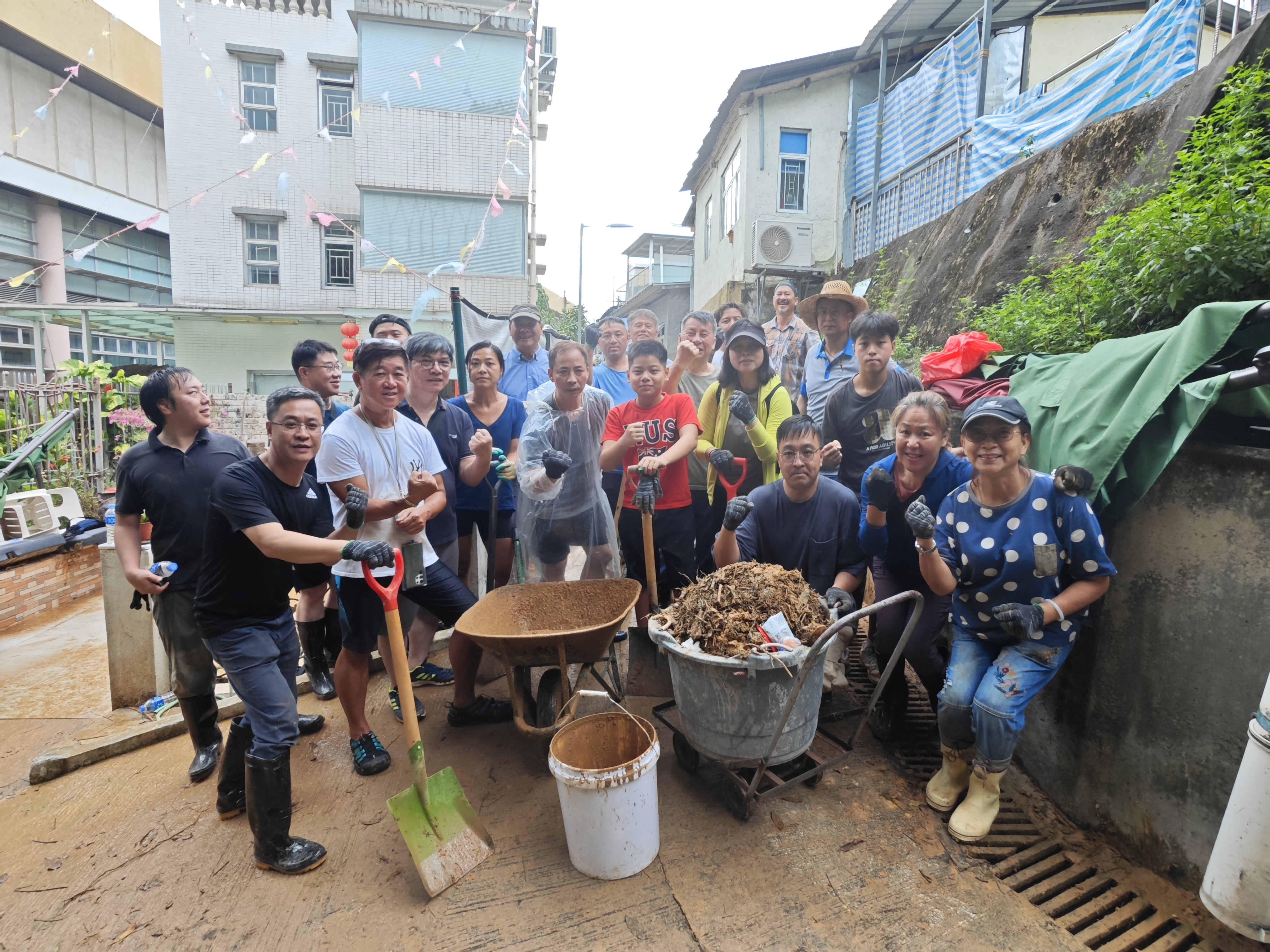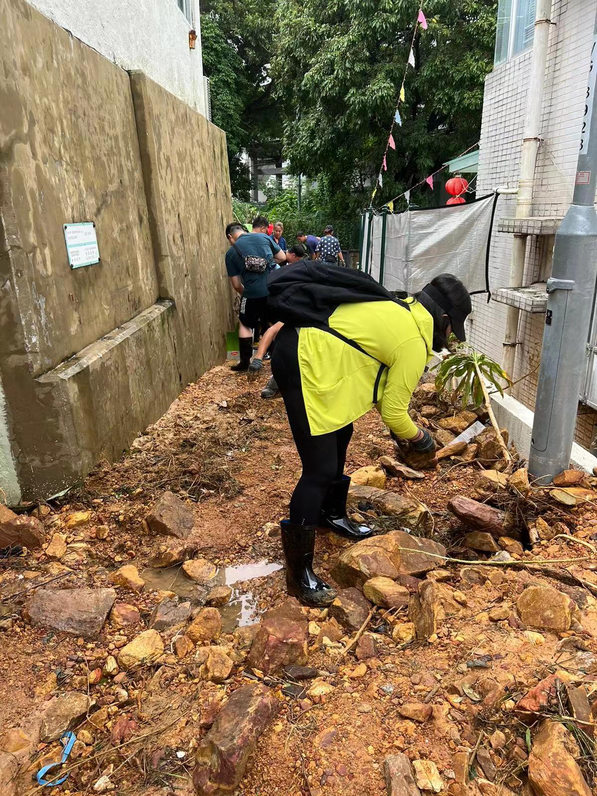 一方有難,八方支援。連日來,陳月明帶同義工協助災民,清理路面。當得知行車道路開通,羅湖村亟需義工協助,不少人都帶同一家大細,風雨不改,幫忙清理泥石,當中包括北區區議員高維基。