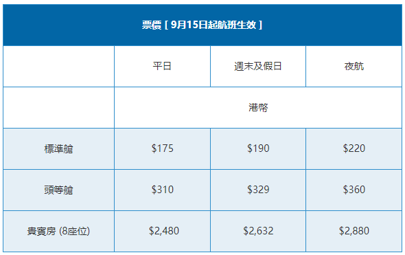 根據兩間船務公司最新公布,由9月15日起,平日普通位票價175元,周末及假日票價190元,夜航220元;噴射飛航氹仔-香港國際機場航線,成人普通票價297元,豪華位票價479元;至於往來香港上環至澳門氹仔的金光飛航,頭等艙平日票價310元,周末及假日票價329元,夜航360元。
