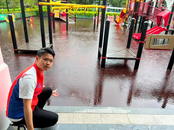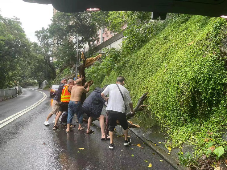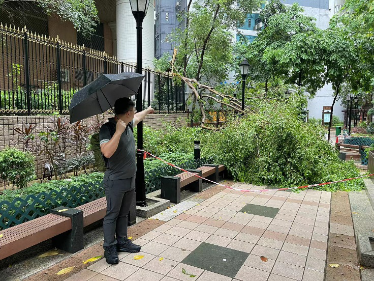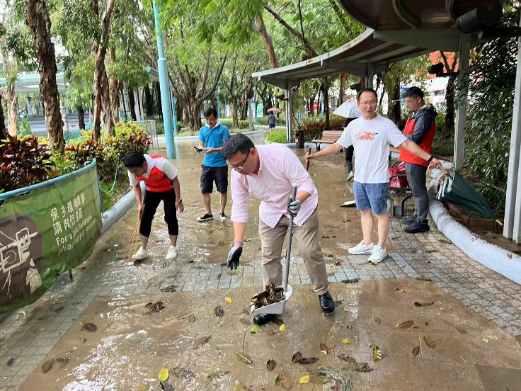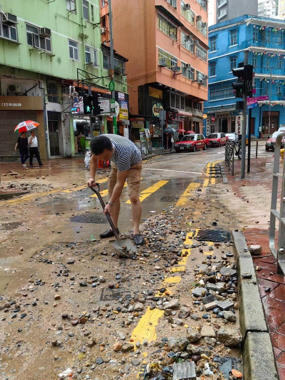 百年一遇暴雨傾盆而下,堅尼地城、中山公園等地出現水浸,直至9月9日仍有不少積水問題,社區幹事劉天正第一時間帶領義工前去清理堵塞的下水口,解決水浸問題。社區幹事呂鴻賓發現上環帝后華庭塌樹,迅速通過中環及半山分區會半台,通知中西區民政處聯絡康文署處理。