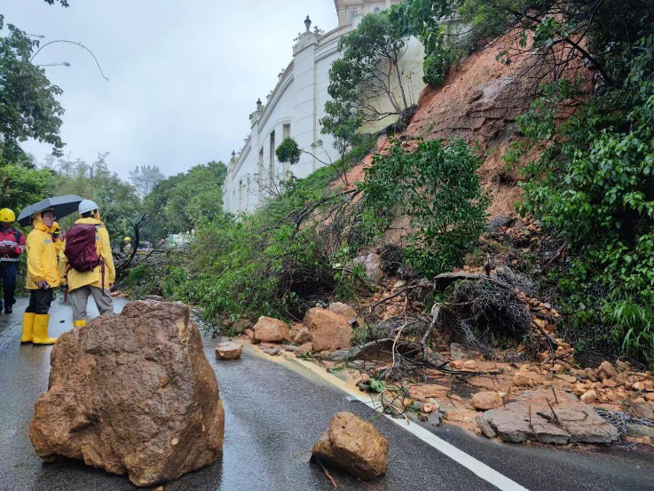 山頂發生多宗山泥傾瀉,道路中斷,居民受困,中西區社團領袖葉永成、夏中建等陪同中西區民政事務專員梁子琪前往視察,會同區議員楊哲安協調政府各部門派出大型機械前往清理,24小時打通道路。
