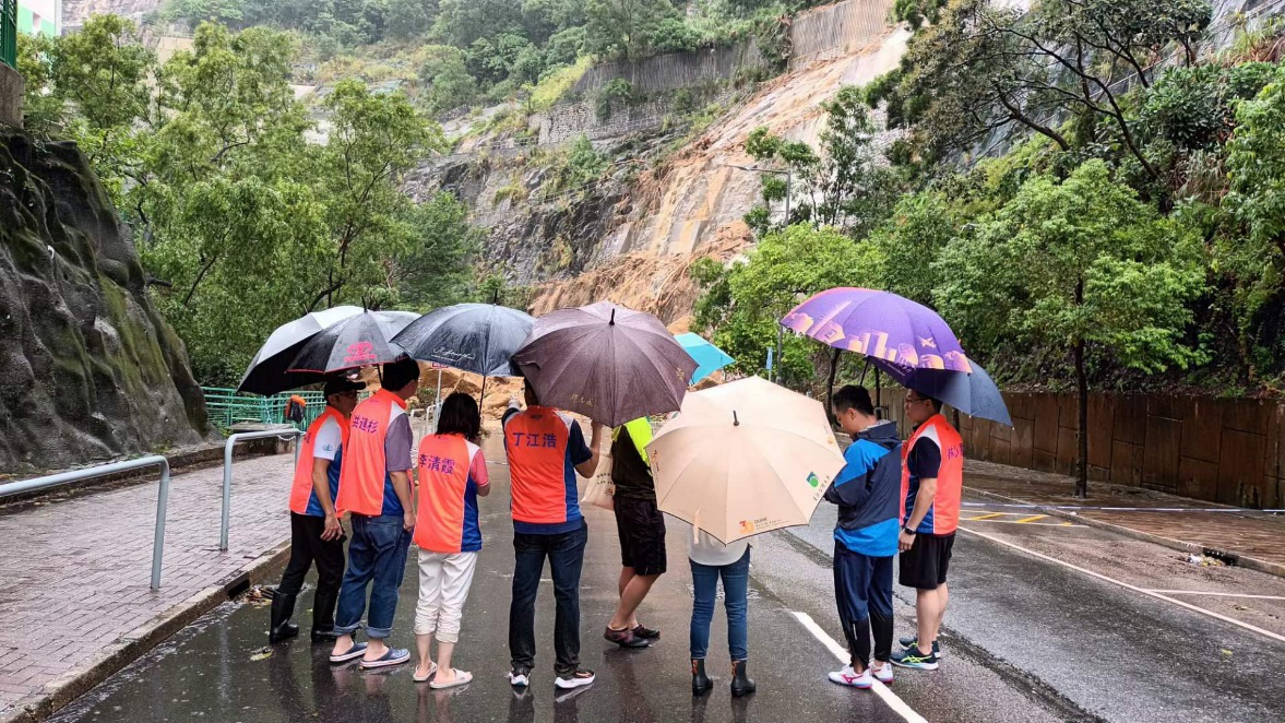 面對薄扶林道、荷李活道公園水浸,以及堅尼地城卑路乍灣公園渠淤塞導致嚴重水浸等災情,立法會議員陳學鋒、全國政協委員葉永成、港島聯中西區地委會主席羅錦輝、社區幹事楊學明、呂鴻賓、張嘉恩、劉家昂等,帶領義工即時前往查勘,協調康文署等部門處理解決。