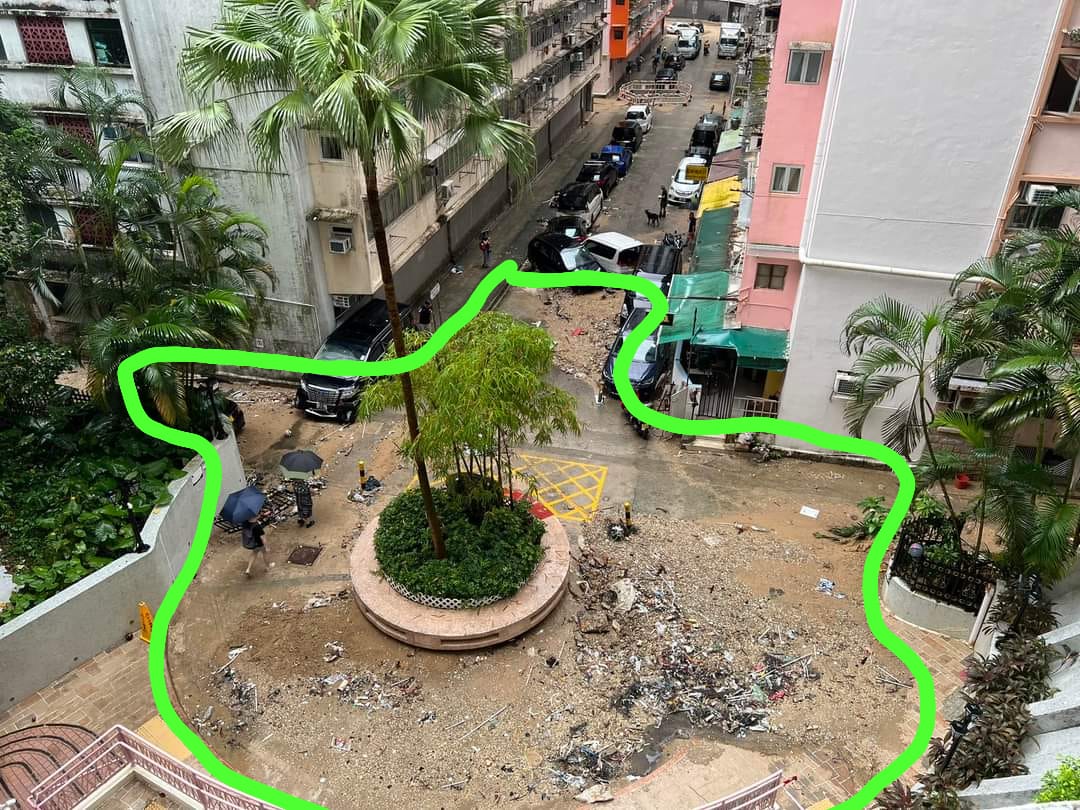 梁熙表示,他和團隊星期六(9日)向有關單位反映問題,恒基星期日(10日)下午12時15分通知他,基本清理已完成,而且附上圖片作實。不過,事後點新聞又收到當區人士反映,稱當時恒基只清理一小部分(見紅圈),而鰂魚涌街近花槽迴旋處和車輛「側切」位置(綠圈)仍然布滿污泥、碎石和雜物,非常影響居民生活。