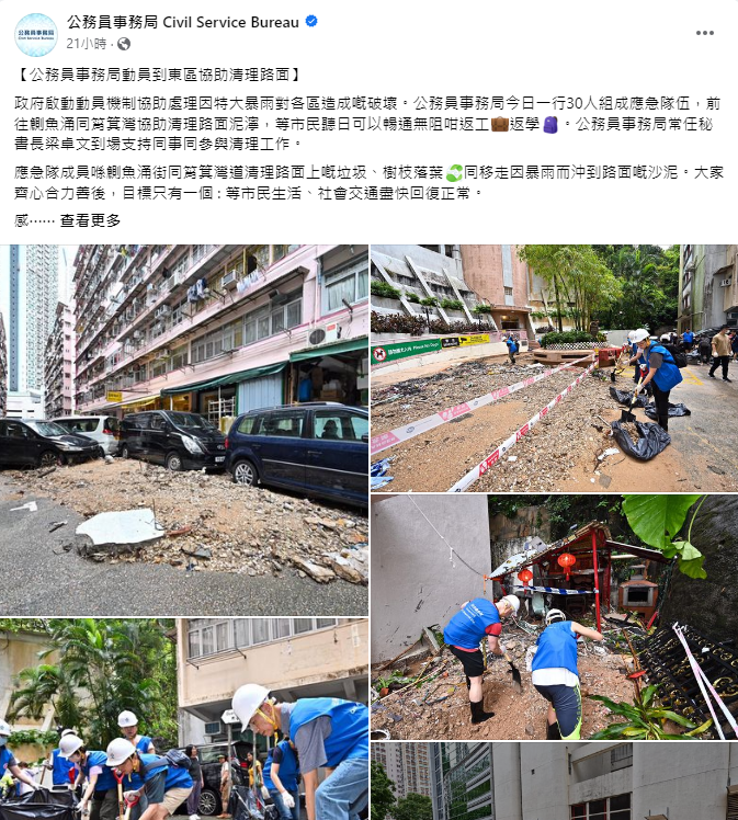 另外,根據公務員事務局的社交平台,該局組織了30人,組成了應急隊伍前往鰂魚涌及筲箕灣協助清理路面泥濘,務求令市民今日(11日)可以暢通無阻返工及返學。