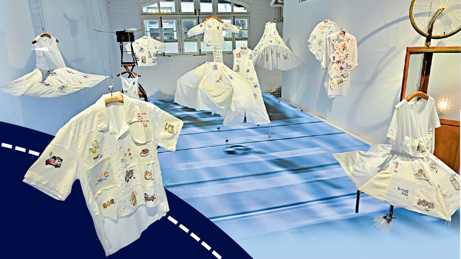 在這些再生衣物中穿梭,觀眾可以看到詩句、麥當勞叔叔、畫像、雙層巴士等圖案。旁邊的展廳播放着這些圖案的創作者們參加工作坊時的感受,再往前走,還可以看到製作再生衣物所需要的工具。