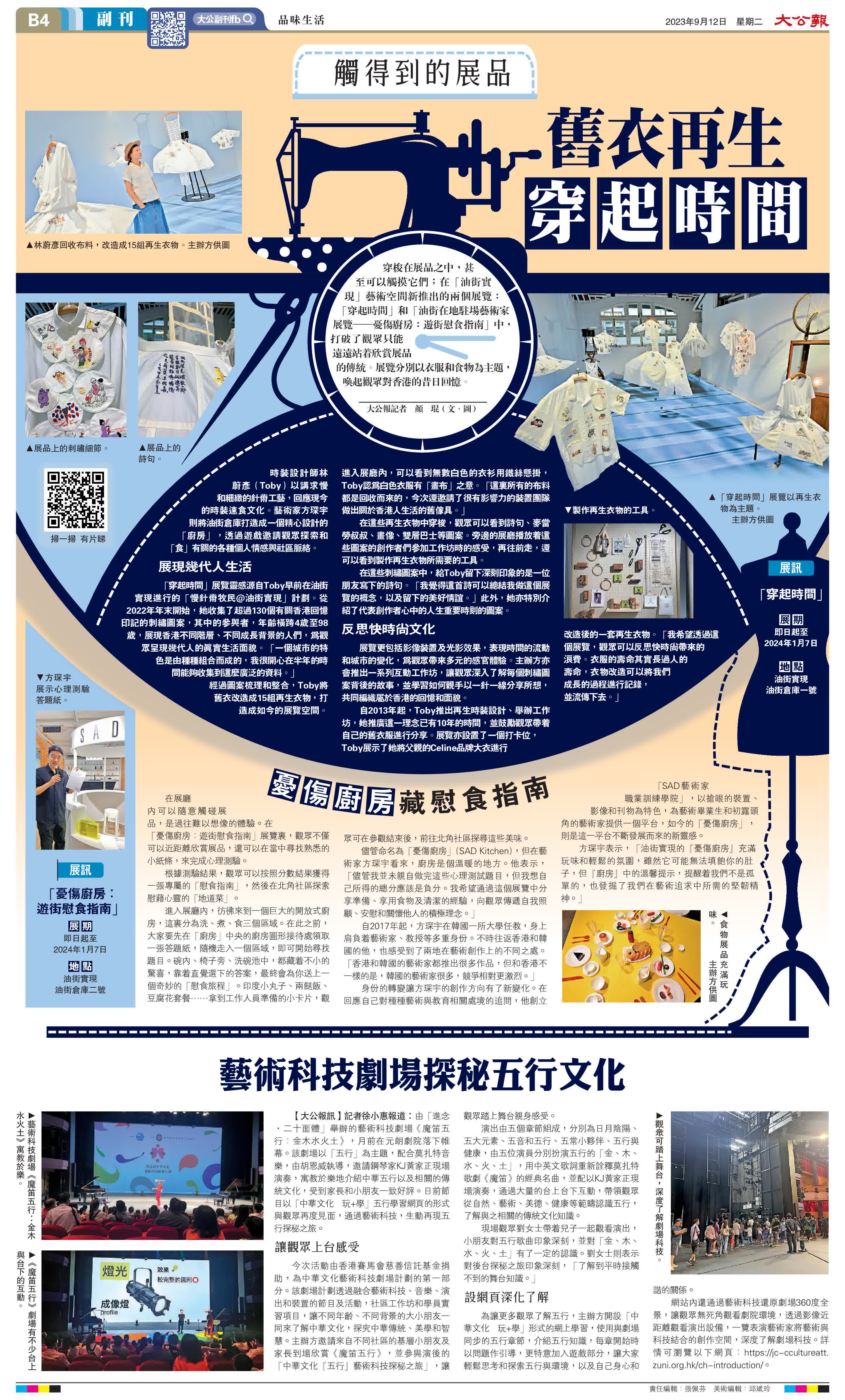 自2013年起,Toby推出再生時裝設計、舉辦工作坊,她推廣這一理念已有10年的時間,並鼓勵觀眾帶着自己的舊衣服進行分享。展覽亦設置了一個打卡位,Toby展示了她將父親的Celine品牌大衣進行改造後的一套再生衣物。「我希望透過這個展覽,觀眾可以反思快時尚帶來的浪費。衣服的壽命其實長過人的壽命,衣物改造可以將我們成長的過程進行記錄,並流傳下去。」