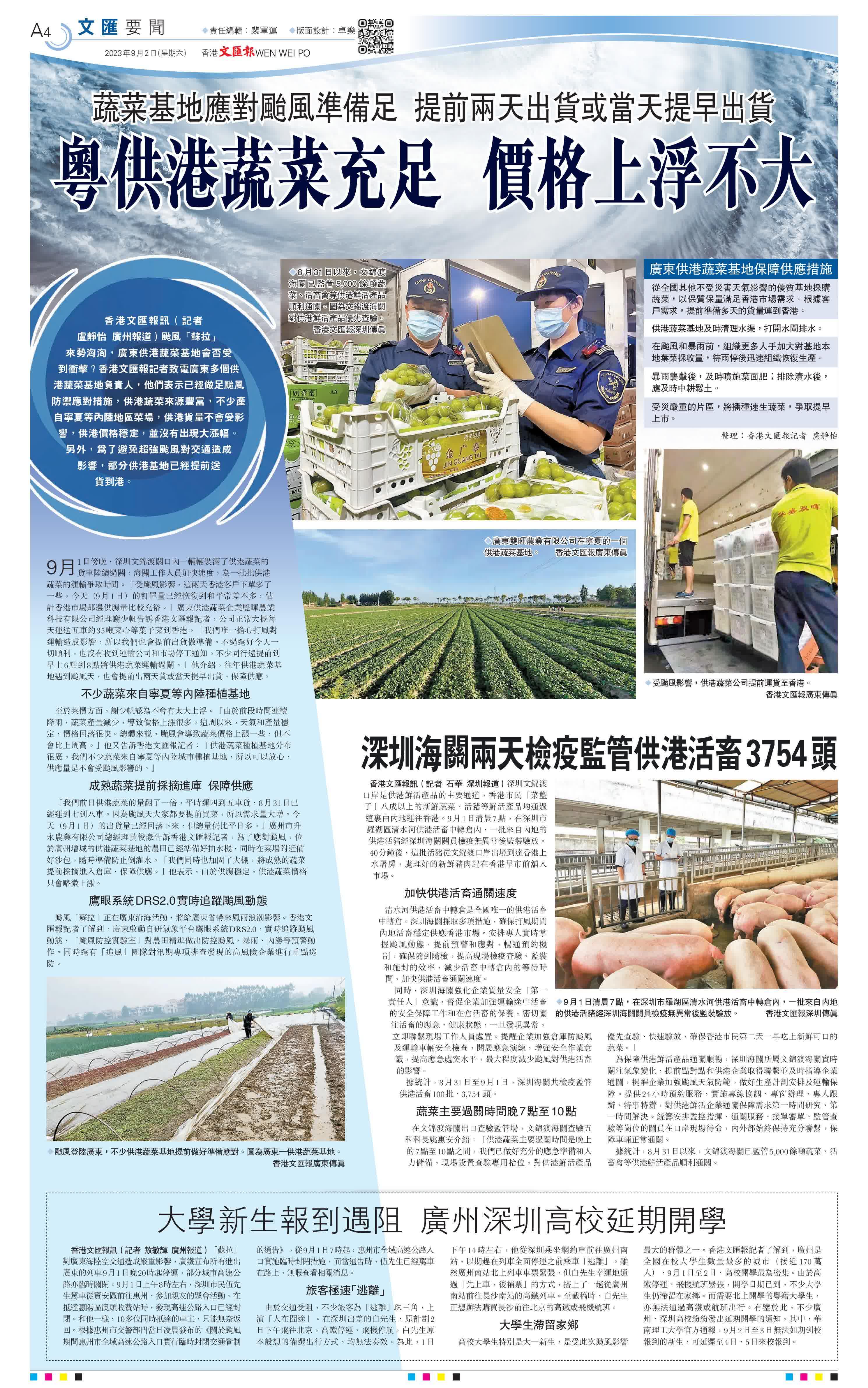 (香港文匯報 記者 盧靜怡、石華)颱風「蘇拉」來勢洶洶,廣東供港蔬菜基地會否受到衝擊?香港文匯報記者致電廣東多個供港蔬菜基地負責人,他們表示已經做足颱風防禦應對措施,供港蔬菜來源豐富,不少產自寧夏等內陸地區菜場,供港貨量不會受影響,供港價格穩定,並沒有出現大漲幅。另外,為了避免超強颱風對交通造成影響,部分供港基地已經提前送貨到港。