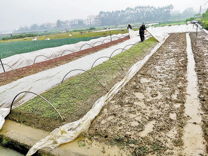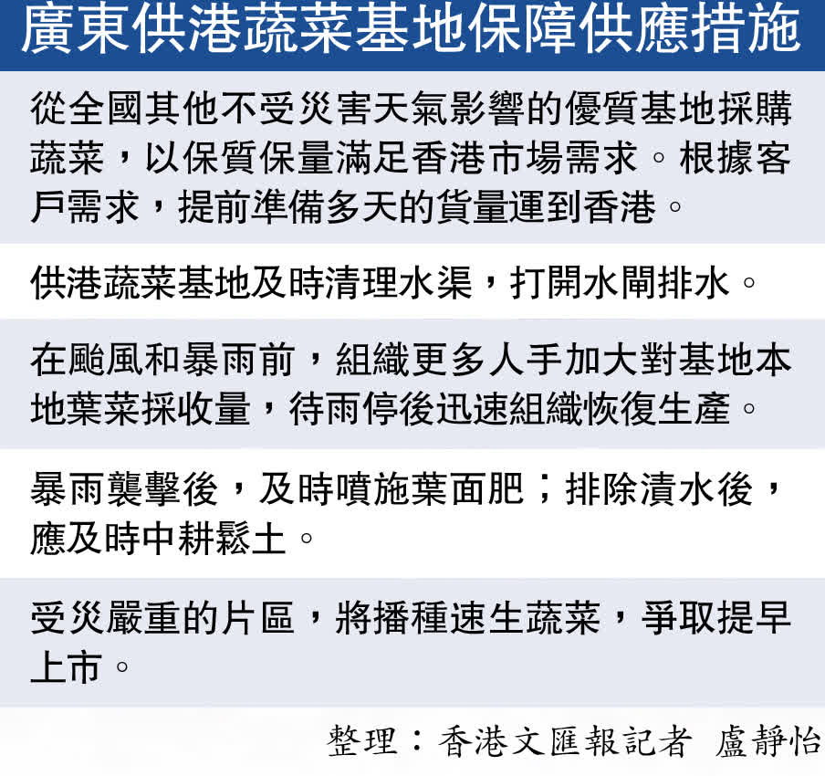 「我們前日供港蔬菜的量翻了一倍,平時運四到五車貨,8月31日已經運到七到八車。因為颱風天大家都要提前買菜,所以需求量大增。今天(9月1日)的出貨量已經回落下來,但總量仍比平日多。」廣州市升永農業有限公司總經理黃俊豪告訴香港文匯報記者,為了應對颱風,位於廣州增城的供港蔬菜基地的農田已經準備好抽水機,同時在菜場附近備好沙包,隨時準備防止倒灌水。「我們同時也加固了大棚,將成熟的蔬菜提前採摘進入倉庫,保障供應。」他表示,由於供應穩定,供港蔬菜價格只會略微上漲。