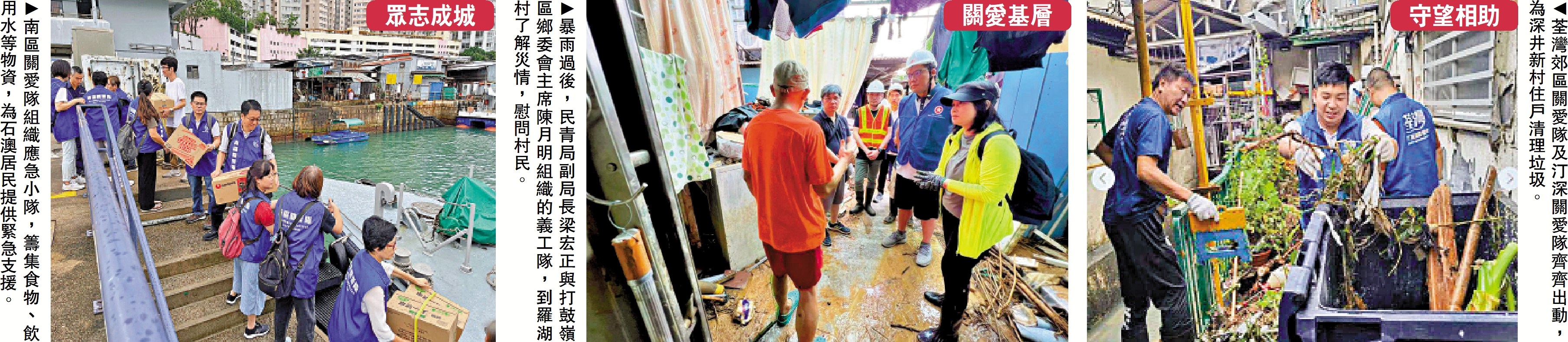 暴雨導致多區發生山泥傾瀉,其中南區石澳更是重災區。為幫助市民盡快恢復正常生活,南區關愛隊及時為受災居民街坊提供各種支援和應急服務。11日上午,南區民政處及南區關愛隊成員,以及政府公務員「動員機制」下調動人員,兵分三路去到石澳村、鶴咀村,以及大浪灣村協助村民清理垃圾、淤泥同雜物。隊員們視察環境,並分工合作,一部分隊員清理樹枝、雜物,另一部分隊員探訪並慰問居民,了解他們需要。