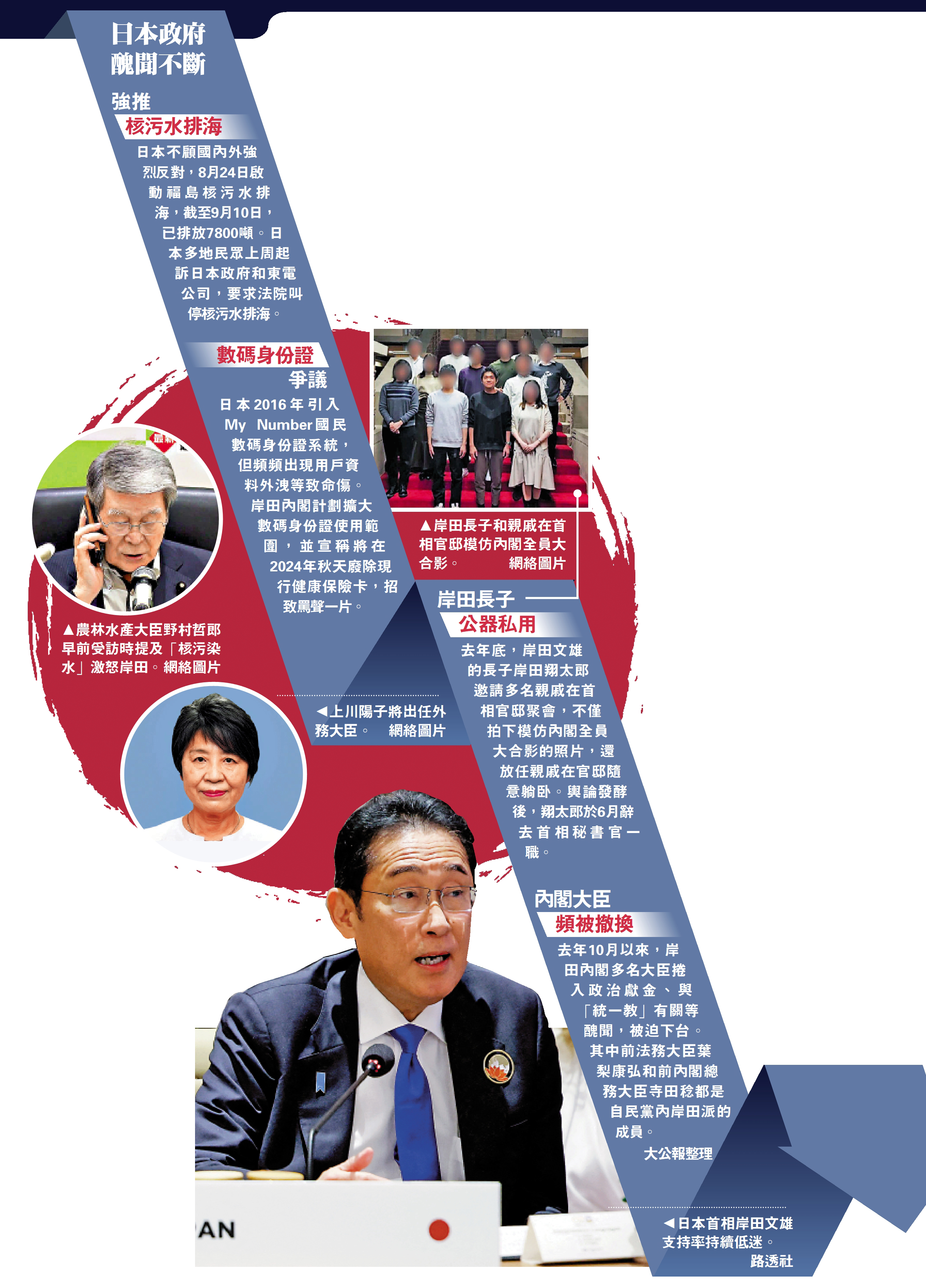 大公報綜合共同社、NHK報道:日本首相岸田文雄預計13日改組內閣並調整自民黨黨內高層人事。根據日媒12日提前曝光的名單,19名內閣成員中,首次入閣人數多達11人。女性閣員從2名增加到5名,為歷來最多。岸田內閣支持率持續低迷,其中強推核污水排海被視為最重要因素之一。值得注意的是,上月因在受訪時提及「核污染水」的農林水產大臣野村哲郎已經被撤換。
