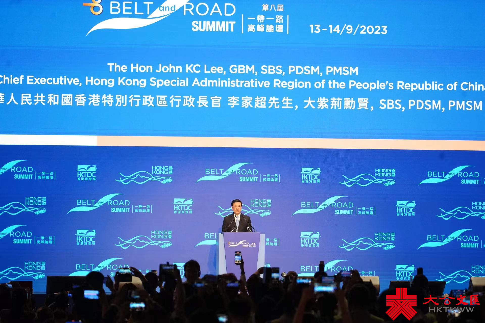 大公文匯全媒體報道,由香港特別行政區政府及香港貿易發展局(香港貿發局)合辦的第八屆「一帶一路高峰論壇」於9月13日至9月14日一連兩日,假灣仔香港會議展覽中心舉行,來自世界各地近6000人、多達100個代表團、至少10個國家政府高層代表參加。