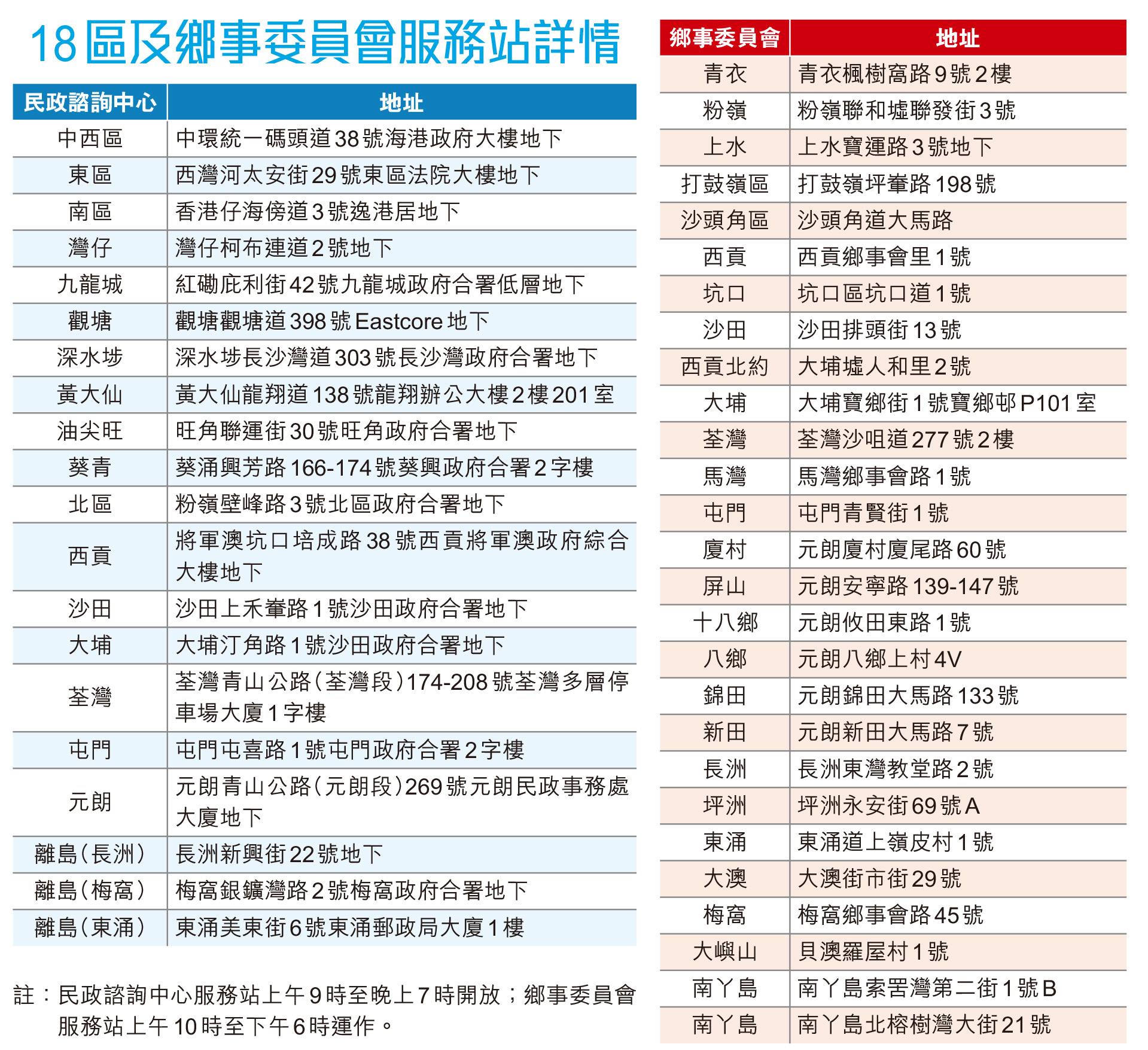 香港仔報道,民政事務總署於今日在全港18區設立專門服務站,協助受颱風蘇拉和暴雨影響而有經濟困難的市民填寫表格,申請政府部門提供的緊急援助基金。香港仔特此整理在全港各區共20間民政諮詢中心設立的專門服務站和新界27個鄉事委員會設立服務站,以及申請方法等資訊,讓有需要市民得到援手。