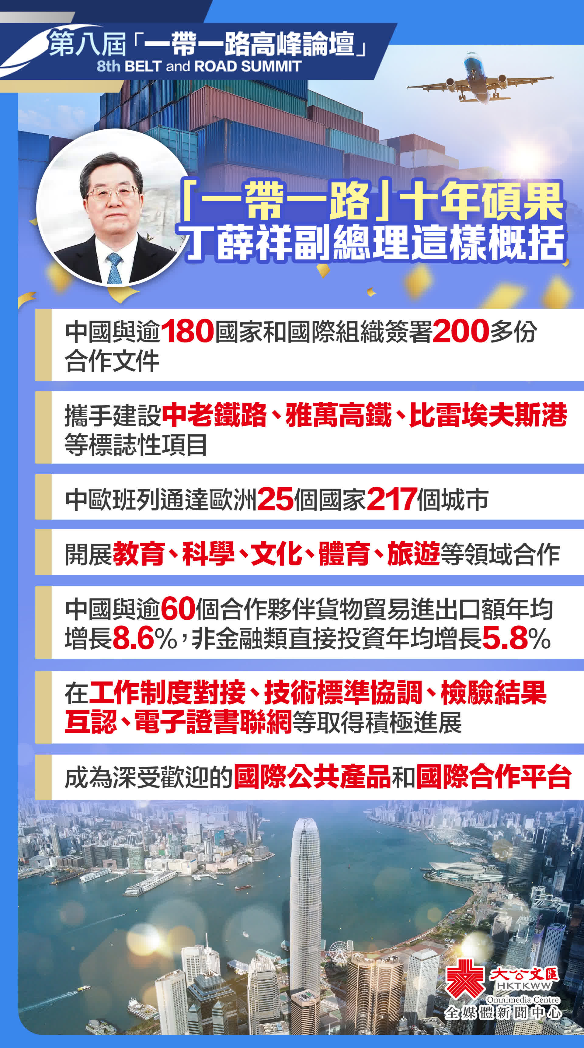 大公文匯全媒體報道,今年是共建「一帶一路」倡議十周年,由香港特區政府及香港貿發局合辦的第八屆「一帶一路高峰論壇」,今日(13日)起一連兩日在灣仔香港會議展覽中心舉行。中共中央政治局常委、國務院副總理丁薛祥提出四點希望,包括希望香港深化區域合作,進一步拓展經貿網絡;希望香港完善金融服務,進一步推動資金融通;希望香港聚焦專業服務,進一步發揮人才優勢;希望香港深化人文交流,進一步促進民心相通。香港各界紛紛表示,在中央全力支持下,香港要積極把握好「一帶一路」戰略機遇,助力國家進一步的發展。