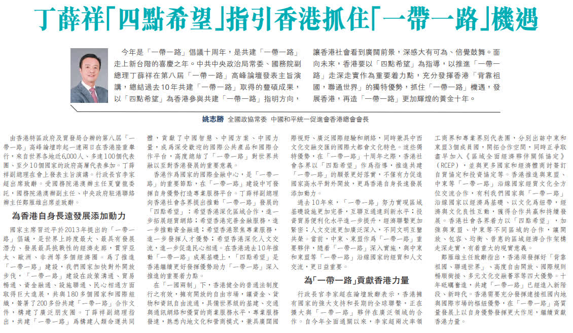 今年是「一帶一路」倡議十周年,是共建「一帶一路」走上新台階的喜慶之年。中共中央政治局常委、國務院副總理丁薛祥在第八屆「一帶一路」高峰論壇發表主旨演講,總結過去10年共建「一帶一路」取得的豐碩成果,以「四點希望」為香港參與共建「一帶一路」指明方向,讓香港社會看到廣闊前景,深感大有可為、倍覺鼓舞。面向未來,香港要以「四點希望」為指導,以推進「一帶一路」走深走實作為重要着力點,充分發揮香港「背靠祖國,聯通世界」的獨特優勢,抓住「一帶一路」機遇,發展香港,再造「一帶一路」更加輝煌的黃金十年。