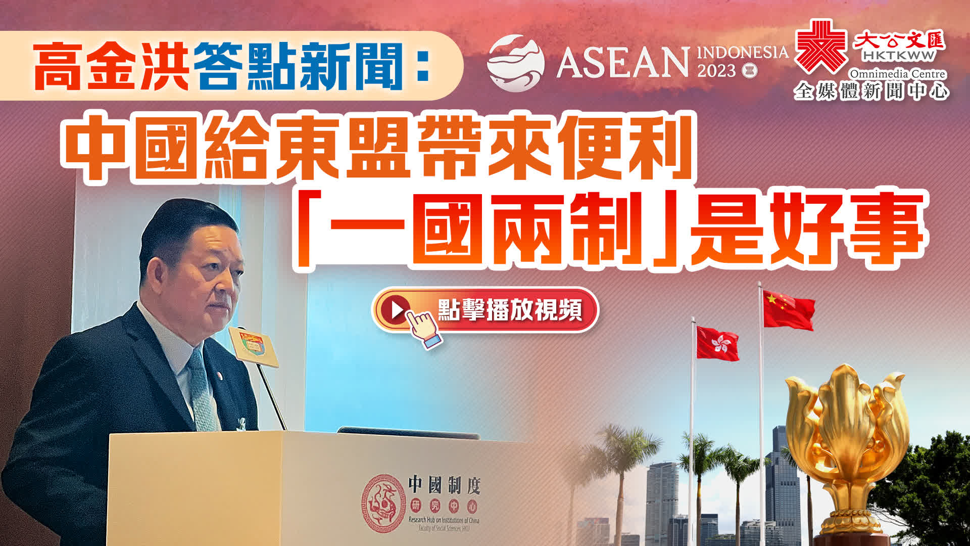 高金洪說,中國在港澳特區實行「一國兩制」制度是好事,這為香港和東盟的合作提供了莫大空間。他表示,香港在中國和東盟之間正扮演着積極的角色,讓三方之間的合作更上一層樓。他強調,中國是東盟第一大貿易夥伴,希望香港也與東盟加強貿易和旅遊往來,擴大合作領域。