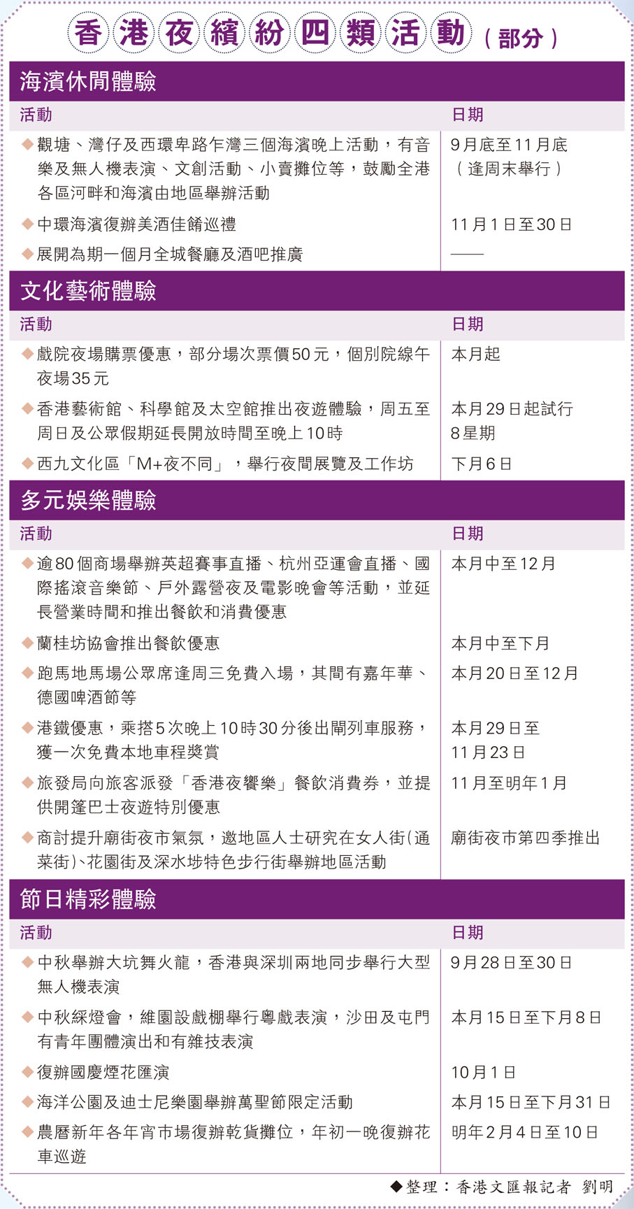 他表示,這次活動由特區政府牽頭,匯聚社會各界力量增添晚上市道的熱鬧氣氛,活動分為四類,包括「多元娛樂體驗」、「海濱休閒體驗」、「文化藝術體驗」及「節日精彩體驗」。當中海濱休閒體驗方面,觀塘、西環、灣仔三個海濱長廊逢周末舉行晚上活動,包括音樂表演、無人機表演、文創活動,並鼓勵各區河畔和海濱地區,利用地區優勢舉辦活動。