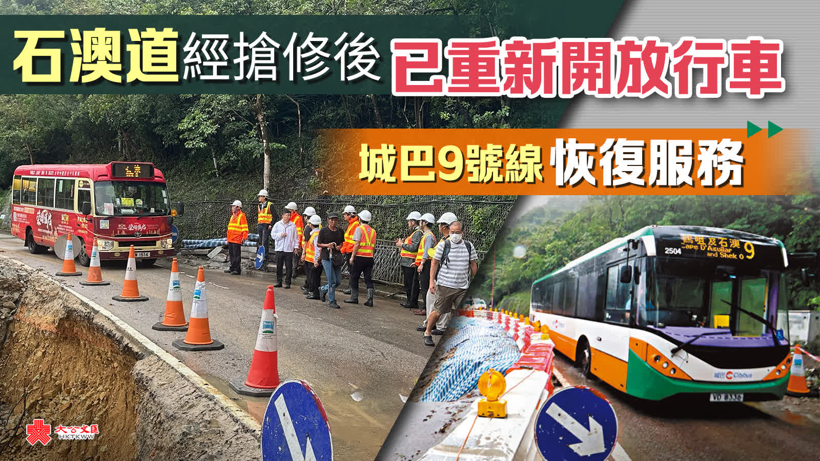大公文匯全媒體報道,運輸署今日(15日)表示,石澳道經搶修後已重新開放行車。經巴士試路後,城巴第9號線(筲箕灣—石澳)恢復以單層巴士行駛,頭班車已於上午6時分別從筲箕灣及石澳開出。