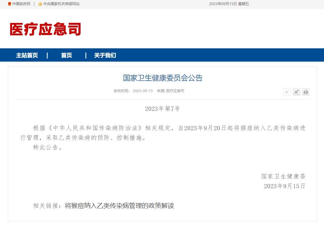 考慮到猴痘疫情將在我國一定時期內持續存在,為進一步科學規範開展猴痘疫情防控工作,切實保障人民群眾生命安全和身體健康,國家衞生健康委決定,自2023年9月20日起將猴痘納入《中華人民共和國傳染病防治法》規定的乙類傳染病進行管理,採取乙類傳染病的預防、控制措施。