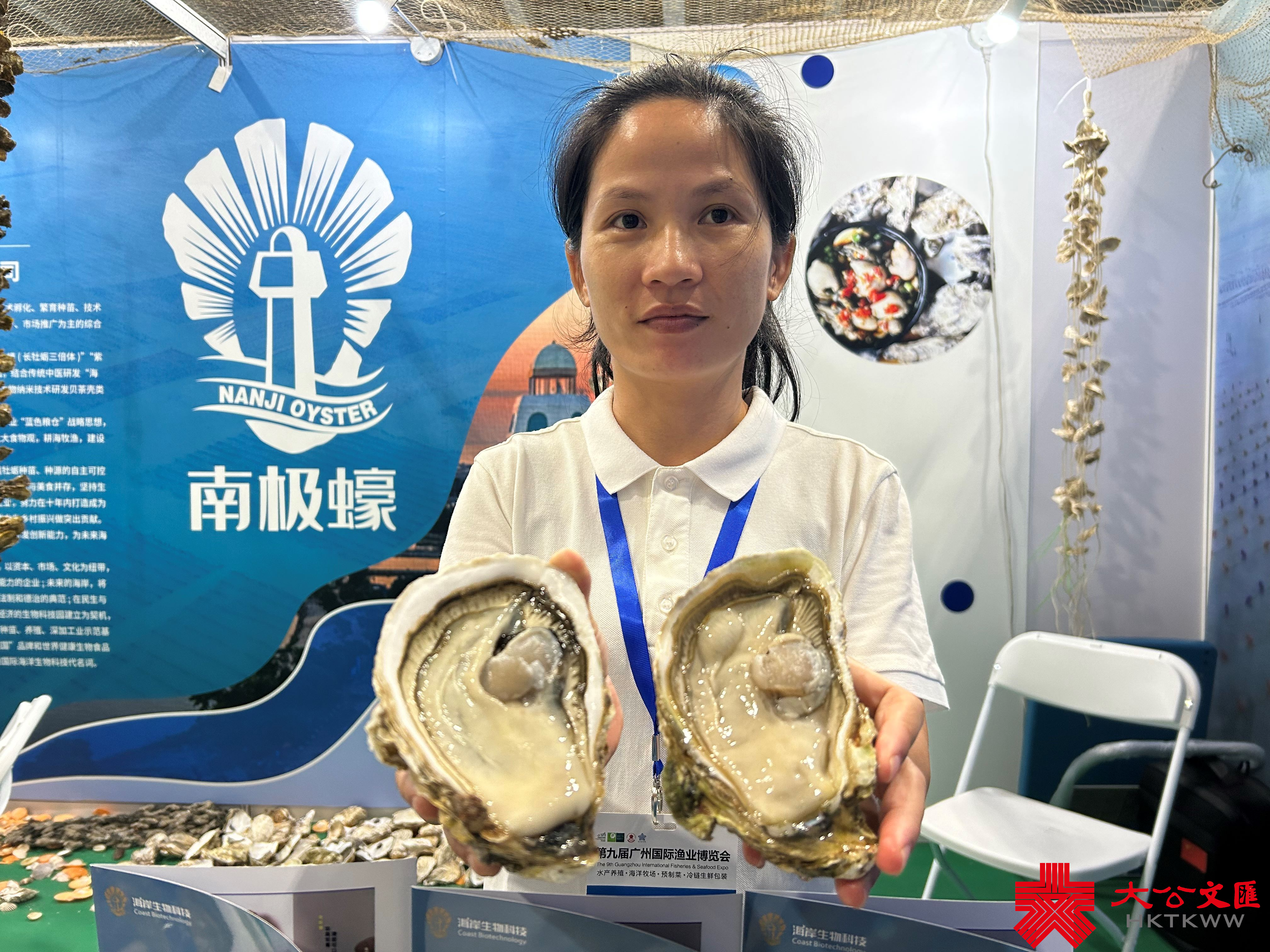 來自湛江徐聞的廣東海岸生物科技有限公司,是當地生蚝養殖龍頭企業,公司展示「黃金蚝」、「白金蚝」(香港牡蠣三倍體)、「黑金蚝」、「紫羅蘭西公主」(牡蠣四倍體),體型大,剝開後如脂如膏,入口濃郁清香。「整個徐聞縣有30萬畝生蚝養殖基地,相關從業人員超10萬人。作為龍頭企業,我們也在不斷加強研發,進一步提升生蚝品質,延長生蚝上市周期,壯大生蚝產業。」海岸生物科技董事長許海飛說。