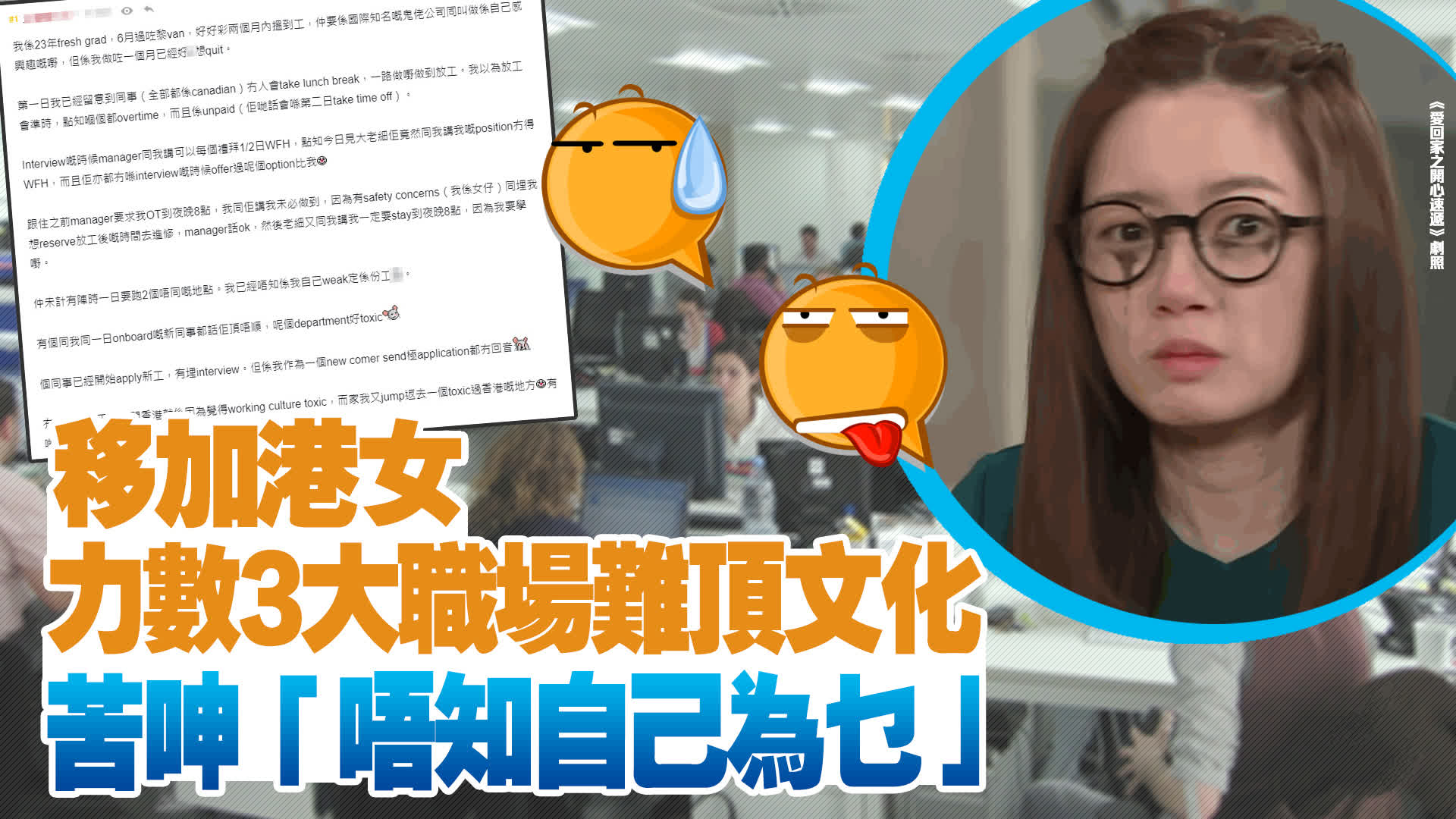 大公文匯全媒體報道,移民後不但要重新適應新生活,亦要面對工作環境的問題,最近有名剛到加拿大工作的港女於網上大吐苦水,指自己於當地一間國際大公司「做咗一個月已經好想quit」,力數該公司有3大難頂位。帖文一出即引起熱議,有網民直指「加拿大worklife 仲衰過香港」。