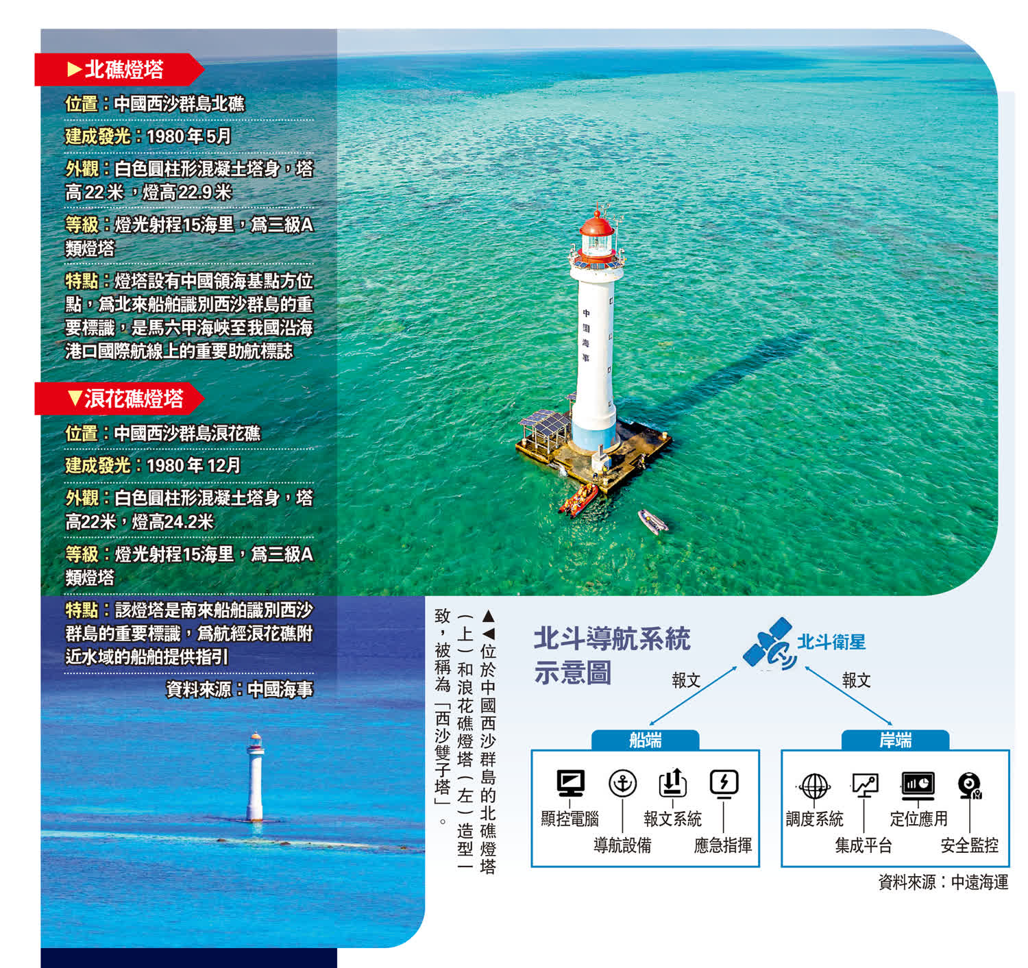 (大公報記者馬靜 北京報道)據交通運輸部海事局發布消息,9月15日,中國西沙北礁燈塔和浪花礁燈塔完成北斗船舶自動識別系統岸基基站的新建工作。兩座北斗基站首次在西沙海域正式投入使用,解決了中國船舶自動識別岸基系統在該海域的覆蓋盲區問題,為南海船舶航行提供更加安全、可靠的導助航服務。有專家分析表示,北斗基站的使用對於提升船舶航行安全,加強海洋生態保護具有重大意義,也將對維護國家主權安全產生積極作用。