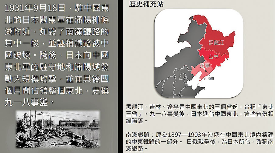 有關的教學資源附有大批歷史圖片,詳細介紹「九一八事變」的經過及要點,例如以時間軸列出日本侵略中國的連串事件,以及內地、香港同甘共苦的經歷,又設延伸閱讀,包括中國文化研究院的「圖說近代」資料等。學校及教師亦可參考上述學與教資源,因應校情採用適當策略,透過不同學習活動,例如中國歷史科課堂、早會或周會分享、德育及公民教育專題講座等,教授學生相關歷史,促進學生全面認識「九一八事變」,進而培養學生的國民身份認同,以及對民族和國家的責任感,並分享「銘記歷史,珍愛和平」的正面價值觀。