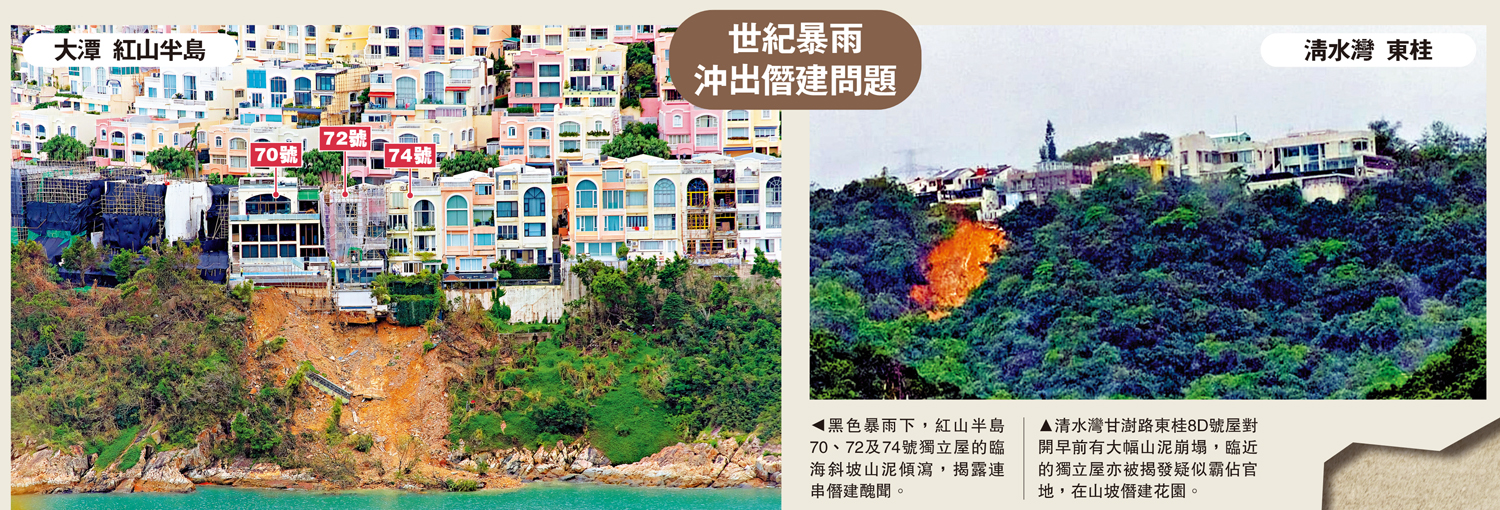 港島大潭豪宅「紅山半島」第70、72及74號獨立屋不敵世紀暴雨,臨海方向斜坡發生山泥傾瀉,暴露地下建築地基懸空,部分花園、平台、欄杆及疑為泳池坍塌,屋宇署經視察後認為72號屋有明顯危險,隨即要求警方疏散佔用人,豪宅頓成危樓。