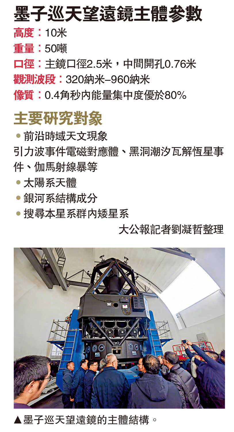 (大公報 記者 劉凝哲 北京報道)中國科學技術大學─紫金山天文台大視場巡天望遠鏡(即墨子巡天望遠鏡)17日正式啟用,並發布仙女座星系圖片,標誌着望遠鏡設備基本達到設計標準,可開展天文觀測研究。墨子巡天望遠鏡是目前北半球光學時域巡天能力最強的設備,可獲取高精度位置和多波段亮度觀測數據,可監測移動天體、光變天體和暫現源,用於高效搜尋和監測天文動態事件,有望在引力波事件電磁對應體等時域天文、太陽系天體普查、銀河系結構和近場宇宙學等領域取得突破性原始創新成果。