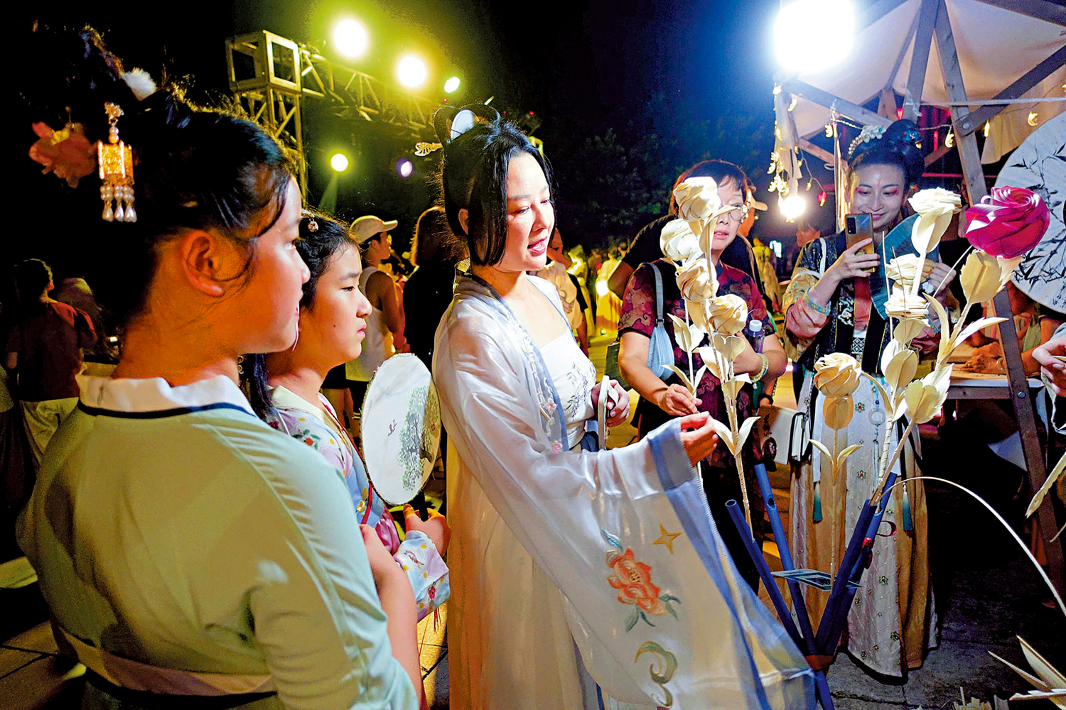 民俗燈籠牆、千年詩廊、夜下遊船、古風市集……記者在「水鄉之夜·夢回宋境」走訪中發現,遊客在進入街區前,可自行選擇到入門處的漢服店接受專業的漢服妝造服務,身臨其境地感受宋朝的繁榮和風采。來自香港旅遊業界的代表也紛紛換裝,有人穿上了華貴龍袍,也有人換上了大俠裝扮,佩上寶劍,分外颯爽;也有換上書生裝扮,搖着摺扇。女生束髮高挽,長袖飛揚,彷彿從古裝劇中走來的人物。