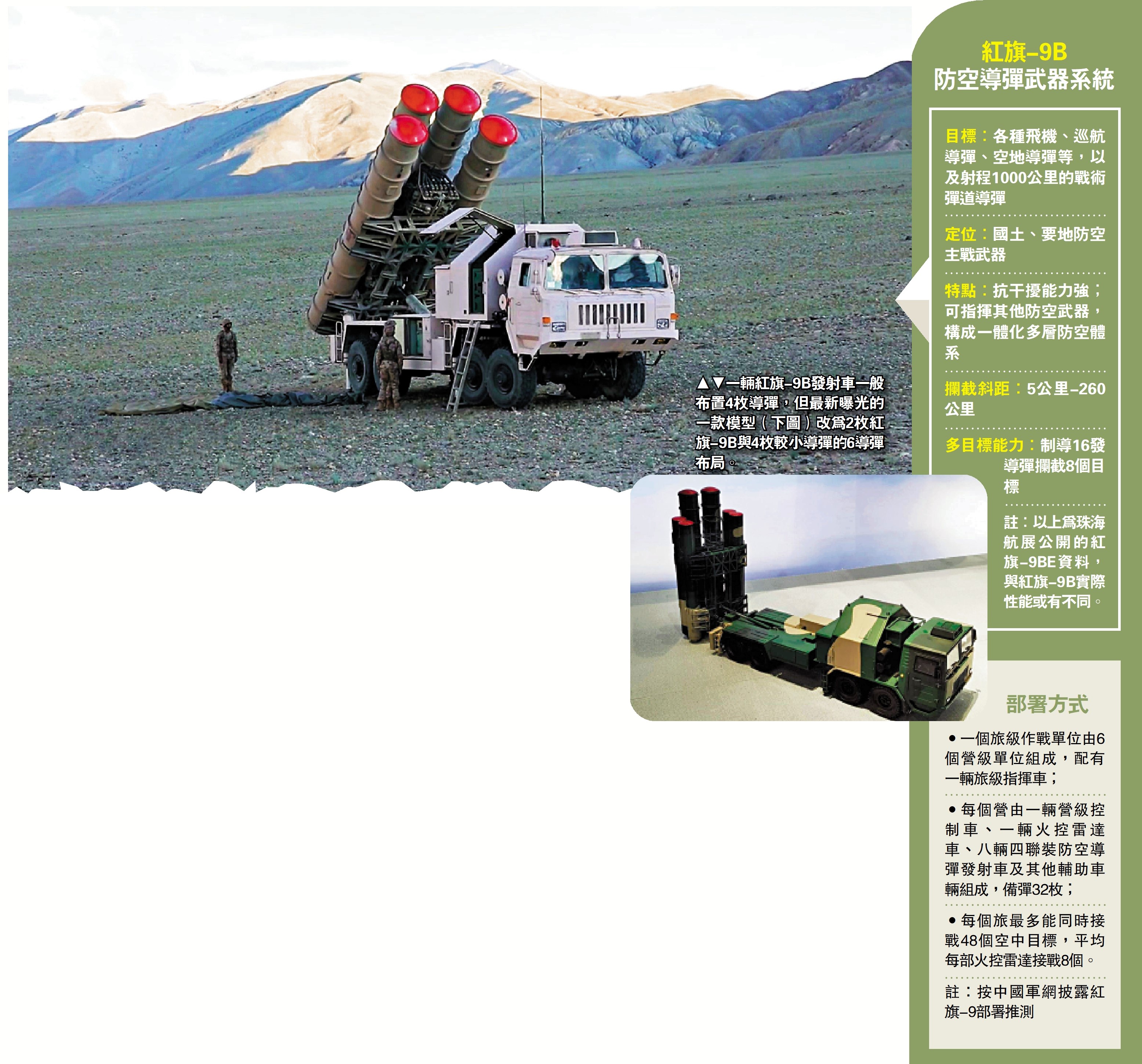 空軍淺米白色塗裝的紅旗-9B遠程防空導彈近日首次亮相,在海拔4600米雪域高原開展訓練,探索高原、高寒、高海拔地區的創新訓法戰法。紅旗-9B是解放軍現役最先進的防空導彈系統,射高30公里,最大速度6馬赫,是遠程防空的主力。是次訓練檢驗了紅旗-9B在高寒高海拔地區的性能,有效鎮戍西南邊陲,攔截戰機、導彈、無人機等各型空中目標,構築防空反導天網。