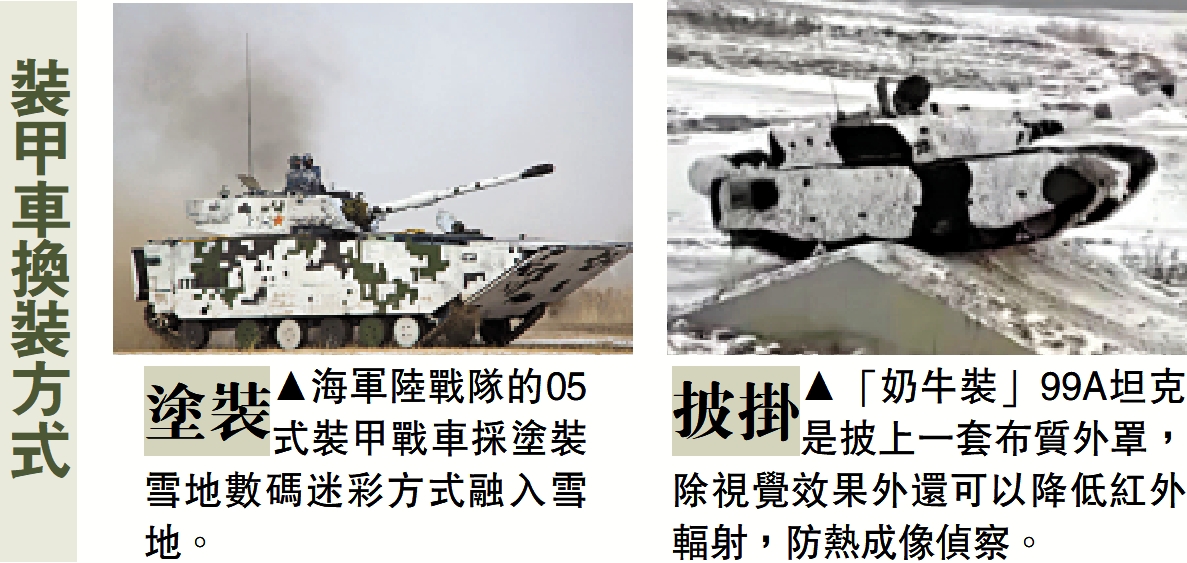 坦克是陸戰之王,通常都採用「軍綠」或者「沙漠黃」塗裝。2021年1月,軍媒首次出現了「奶牛裝」的99A坦克,在白色底色上搭配不同色塊、線條,在冬日雪野環境下實戰訓練。
