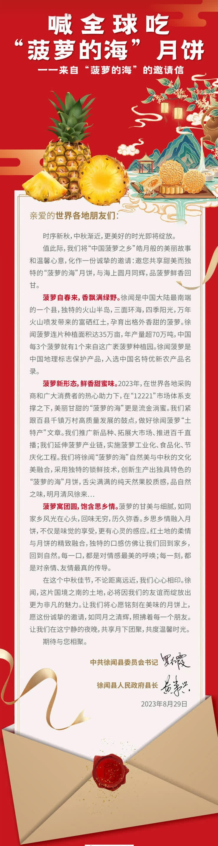 距離中秋還有不到半個月時間,日前,廣東省湛江市徐聞縣委書記羅紅霞一封喊全球吃「菠蘿的海」月餅的邀請信掀起菠蘿月餅的訂購熱潮。