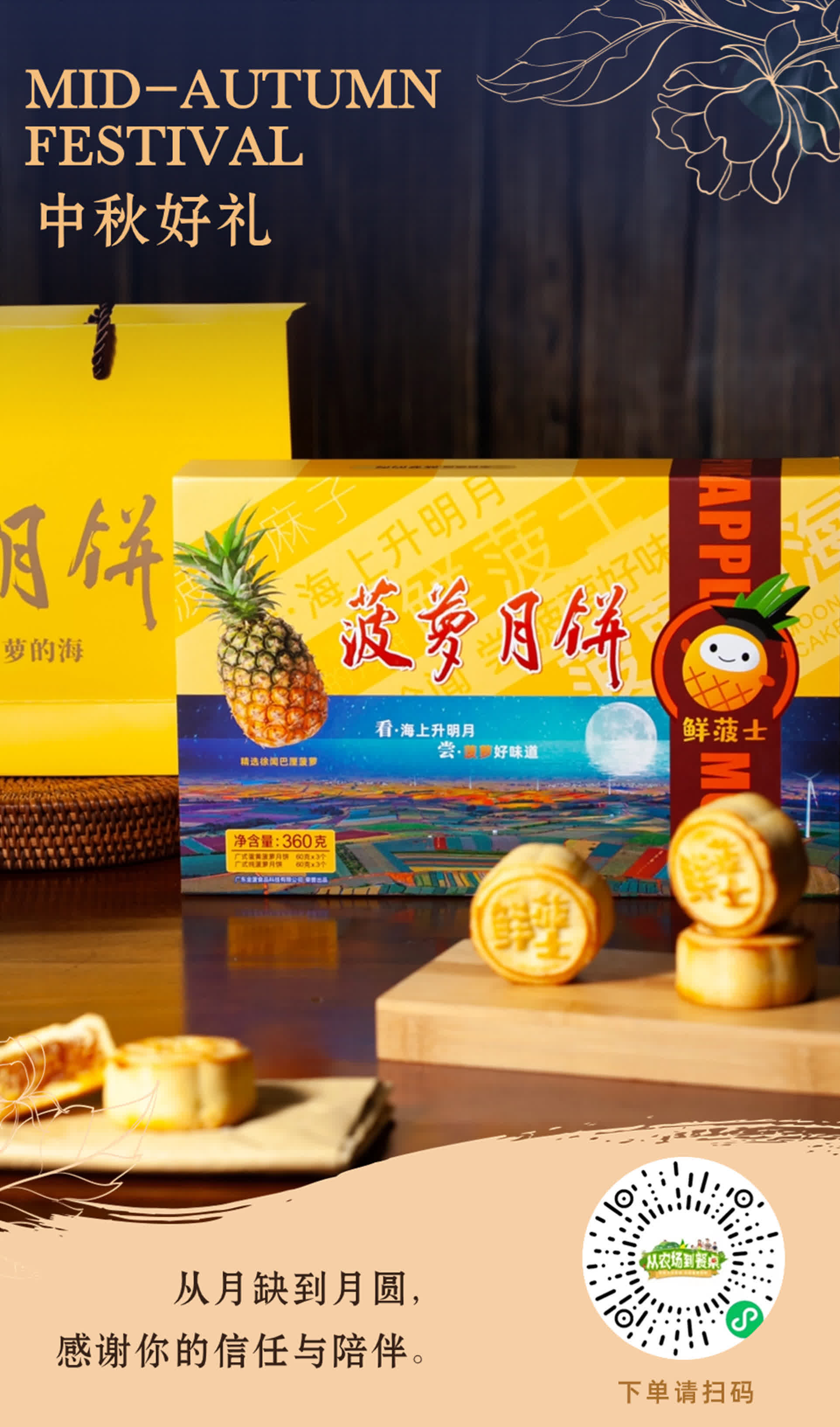 菠蘿月餅,形似圓月,佔盡「圓滿」的好意頭,也代表堅定向着希望而行的追求。2018年,徐聞菠蘿滯銷;2019年春天,面對15萬菠蘿果農的期盼,時任廣東省農業展覽館副館長黎小軍帶領工作組,深蹲徐聞、深耕菠蘿產業,「12221」在徐聞大地孕育而生。