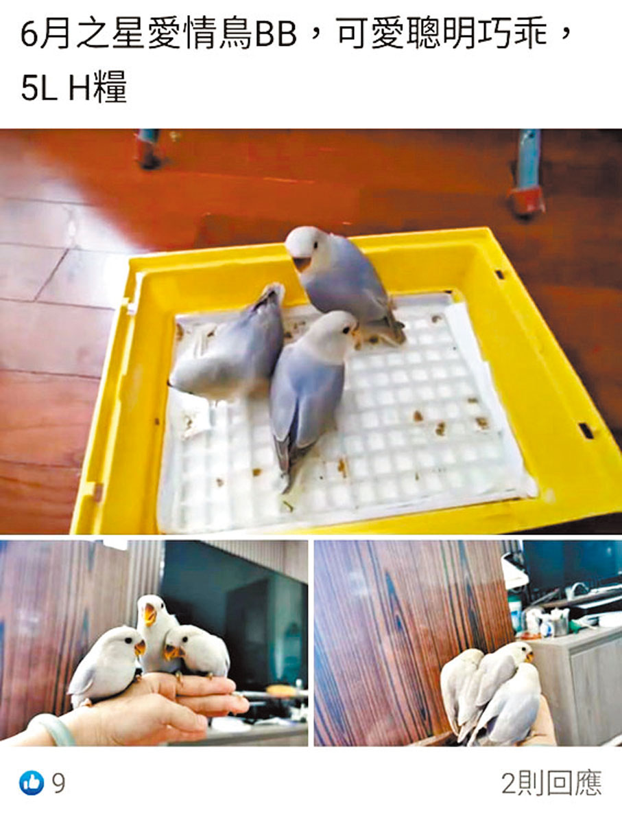 「愛情鳥BB,人手餵大,有興趣歡迎交流」、「好可愛的愛情鳥BB,等家長來接放學,有意可PM」、「本地繁殖愛情鳥,保證健康,500粒糧」……這些公然出售自家繁殖鸚鵡的帖文近日湧現社交媒體,部分「自繁者」明知無牌買賣鸚鵡屬違法,放售時只敢以暗語「雀糧」暗示交易金額,不過有買雀仔經驗的人都心知肚明,「500粒糧」是「500大元」的意思。
