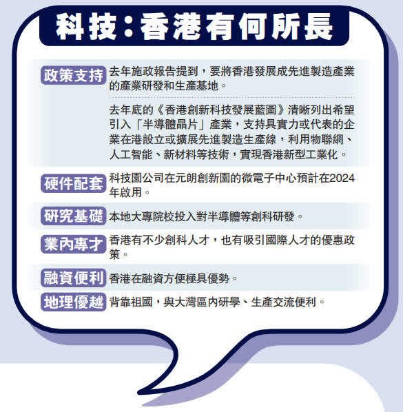 去年底發表的《香港創新科技發展藍圖》,清晰列出希望引入「半導體晶片」產業(包括芯片),支持具實力或代表的企業在港設立或擴展先進製造生產線,利用物聯網、人工智能、新材料等技術,實現香港新型工業化。