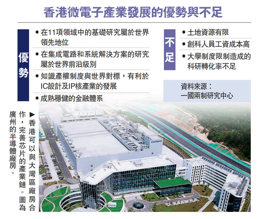 香港科技大學(廣州)功能樞紐微電子學域主任須江教授近日接受《大公報》訪問時表示,製造芯片的產業鏈非常長,因此需要大量的土地資源,而目前沒有一個灣區城市擁有具備整條產業鏈的條件。他認為香港可以用好河套深港科技創新合作區,在科研開發領域參與大灣區微電子的建設,在大灣區其他城市建立廠房或與當地廠房合作。他指出,隨着產業鏈的興起,大灣區會湧現很多人才缺口,所以要鼓勵本港微電子人才赴灣區內地城市就業。